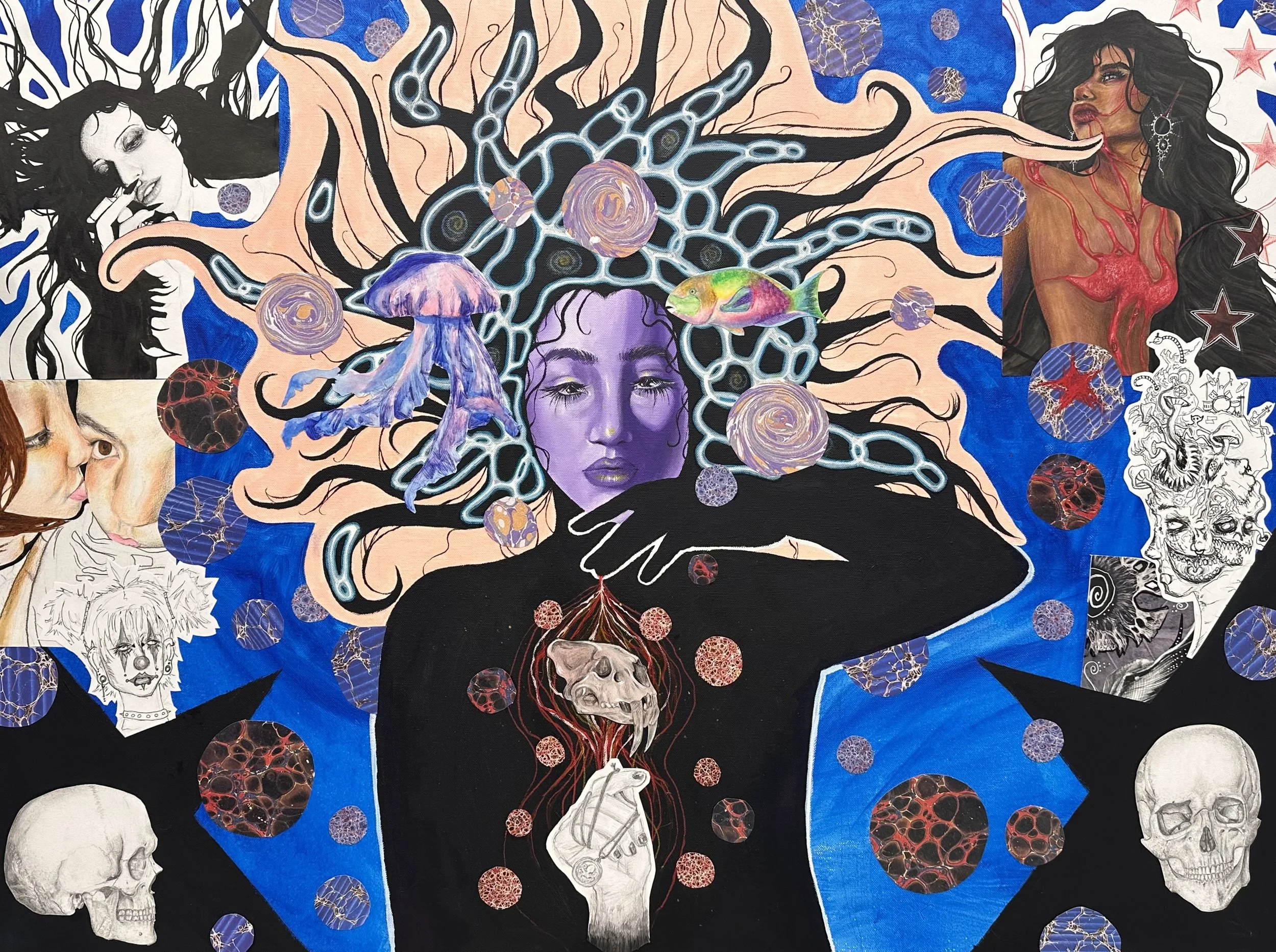 This artwork I made with the intention of displaying my full and true emotions regarding art. The piece was made with my best attempt at not focusing on the end result and committing to the process of the art. The artwork was made as a sort of ode to my best friend, who I derive a lot of inspiration from, and myself. The piece is titled optical regurgitation as it feels like a sort of visual representation, or regurgitation, of all the things I love most about art and all that inspires me within art. This piece helped me explore my freedom as an artist and to do this within it many different mediums were used such as acrylic paint, collage, colored pencil, ink, graphite, alcohol markers, and more.
