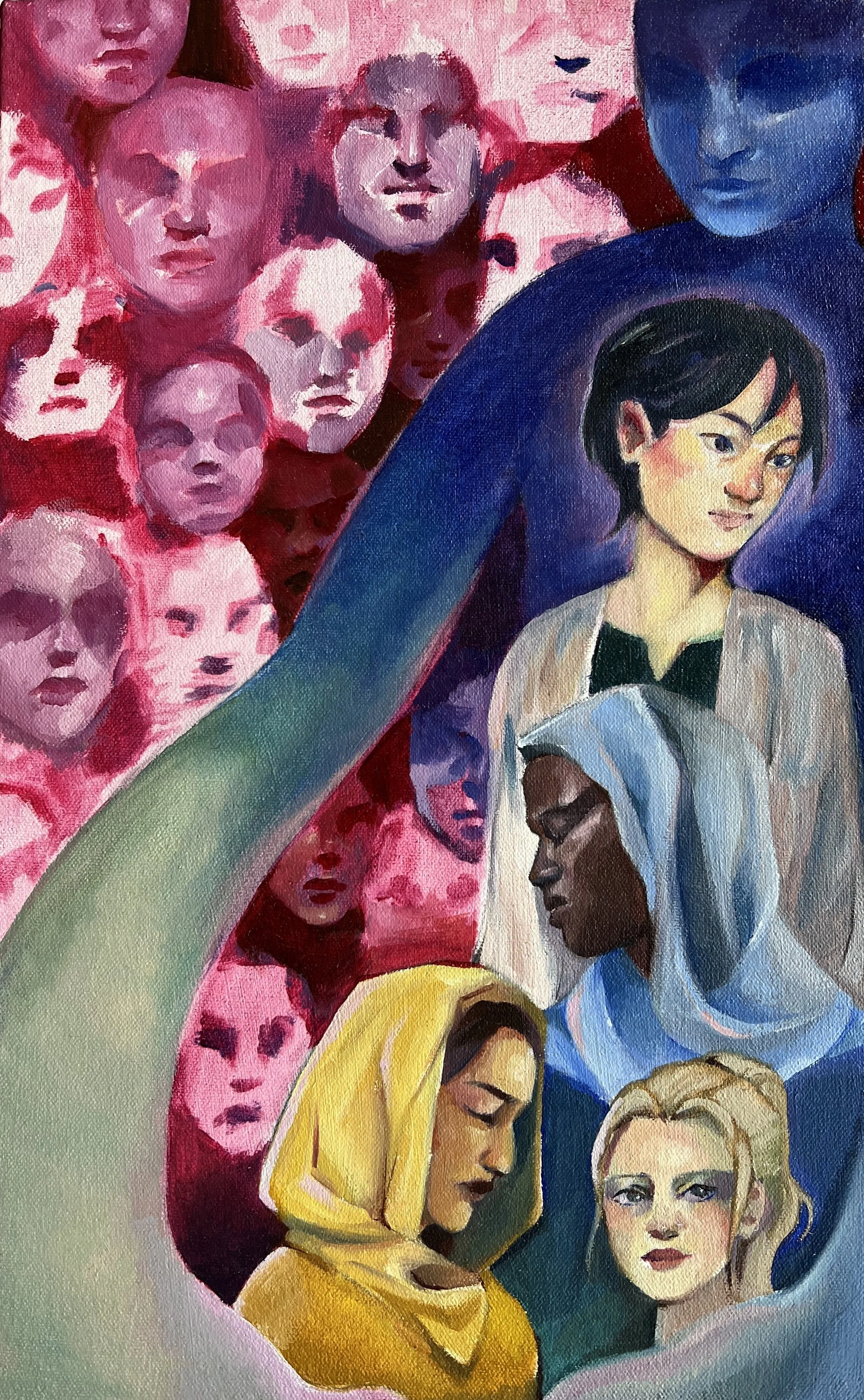 Refugees share a unique, ongoing history. I decided to base my piece around the past and future of refugees, and their intrinsic connection. Through centuries of the human experience, people have fled their homes for different reasons; however, the unknowns they face, and the changes they undergo, are all analogous with a story of resilience and resourcefulness. The bright fabric of life entwined in their clothing; the insurmountable variety of refugees represented in a united obscurity; a mysterious figure wraps them up in an embrace. I dedicate this piece to refugees, like my mother and her family, who built comfortable lives for themselves in the US, and still–to this day–spare a thought for current refugee crises.