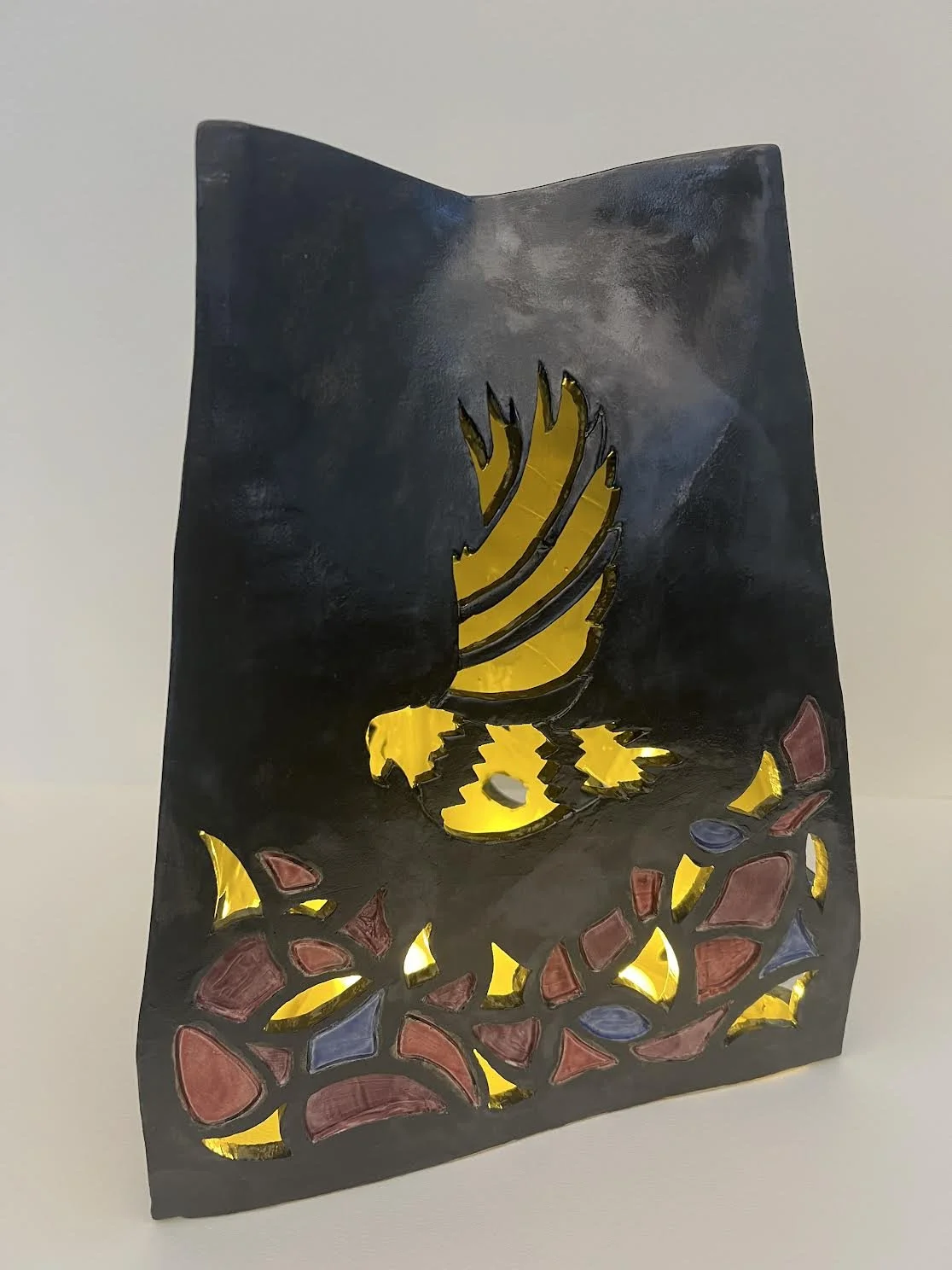 This artwork balances simplicity and skill, embodying a delicate harmony. The bird, though seemingly basic, emanates a fragility that juxtaposes the bold black backdrop. the intricately carved sections around the base add depth and visual intrigue, featuring varying hues that captivate attention. In this piece, My approach reveals a profound interplay of form and contrast, creating a captivating narrative within the subtleties of color, carving, and composition.