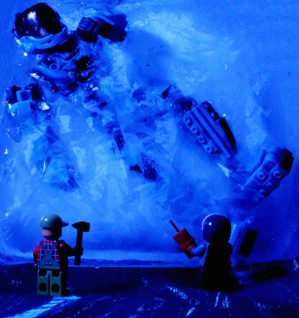 This is a photo of two explorers that have stumbled across a giant figure frozen in the ice. I photograph legos and try to make scenes that are inaccesible orcannot be made in the larger world. To make this photo, I froze a giant lego figure in a container in my freezer. Then, I took a patterned sheet, the frozen lego giant, and two lego mini-figures and set them up in a closet. I added a color light and put the sheet under the ice to make the environment look like a cave. Then, I took the photo.