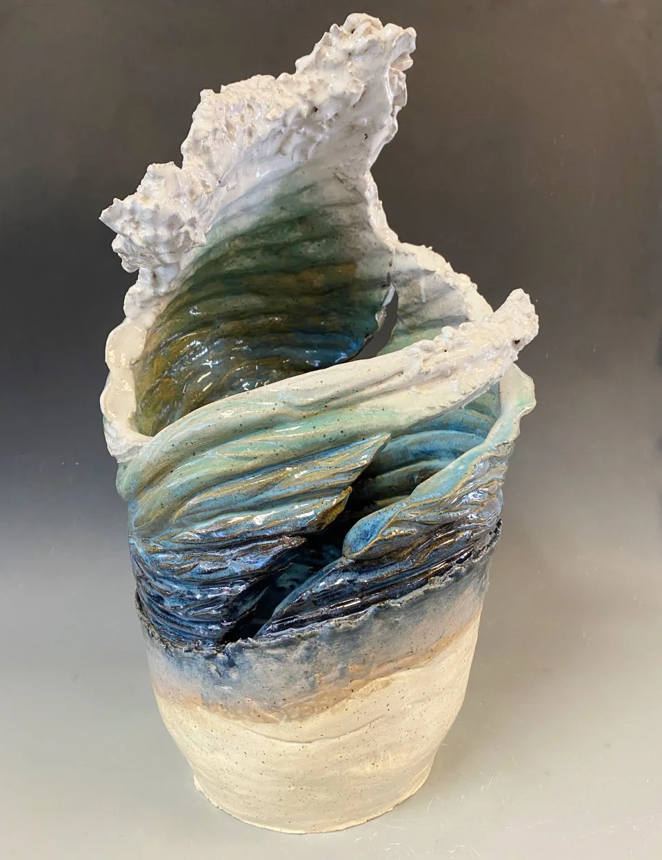 The Wave is a handcrafted piece that was built using ceramic coils. Each coil has textures to mimic the ocean's fluidity and form. The bottom of the piece depicts the interaction between the ocean and the sand; the glazes melded under the extreme heat in the kiln to create the illusion of wet sand, transitioning from land to water. Going up towards the top of the work, the glaze colors go from a dark blue to a light blue, and finally to a white-colored glaze which is the foam of an ocean wave. The various glazes that were used illustrate the complexity and beauty that the ocean possesses. The rough texture of the foam and the curvature at the top of the wave attempts to portray movement and the ever-changing tides within the ocean. Paralleling this concept, life constantly changes as we experience new phenomena. While this change is difficult, it presents opportunities to grow and learn, thus revealing the beauty of such events.