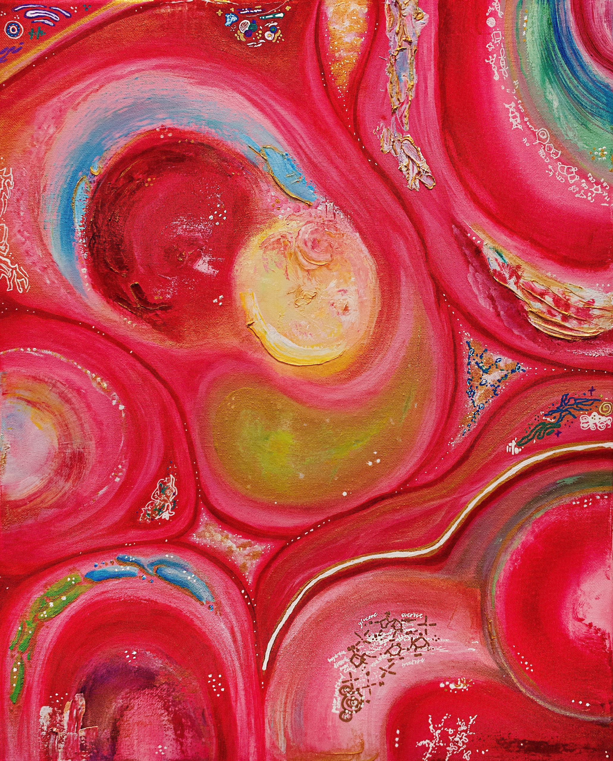 ”Amalgamation” (A4M2LgTion) is a work born from my interest in the intersections between art and science. In this piece, I utilized oil and acrylic paints, metallic markers, dried paint textures, and detailed drawings to explore the hidden beauty of life on a microscopic level. I combined traditional and experimental techniques to illustrate a symphony of cellular patterns and organic structures. Inspired by the beauty in microscopic ecosystems and organized chaos in neural networks, this piece is meant to feel alive, like peering into the inner workings of a living organism. The shimmering metallics evoke the energy of neural activity, while the textured surfaces represent the fragility and strength of biological systems. The artwork speaks to how the worlds inside of us, though unseen, are as vibrant and dynamic as the universe surrounding us.