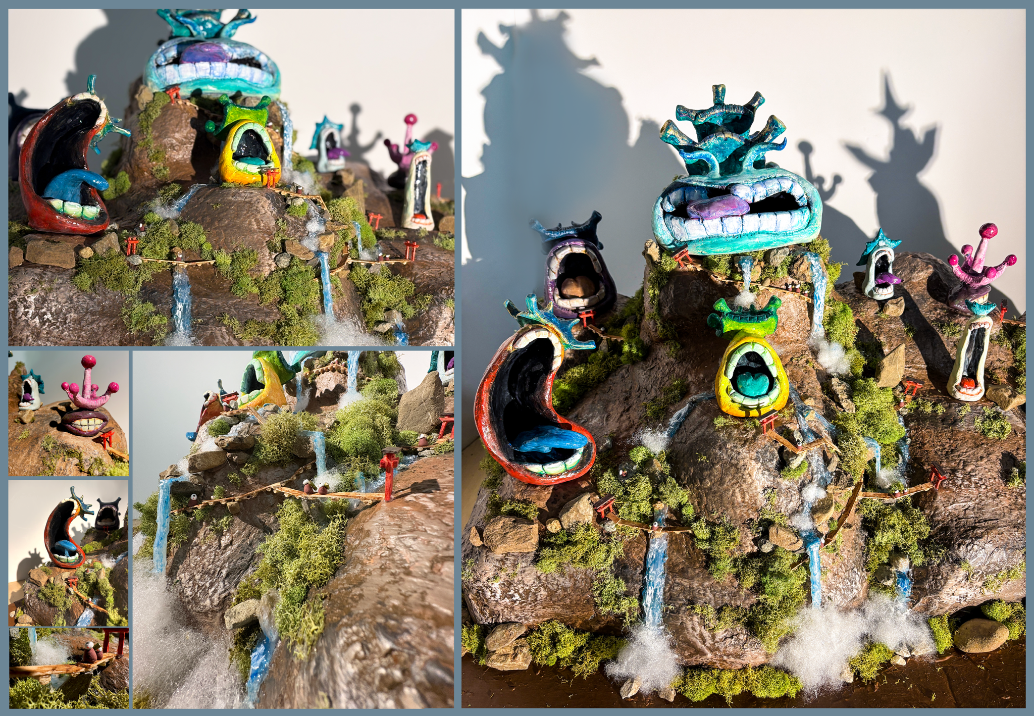 This sculptural piece reimagines the iconic mountains and monasteries of East Asia as a vibrant, surreal landscape full of personality and symbolism. The mountain has large, colorful monsters whose expressive faces are capped with ornate temple roofs, blending the traditional architecture with playful fantasy. Each monster represents a distinct state of mind encountered on a spiritual journey; the mountains bring the viewer into an exploration of self that is as chaotic as it is sacred. Waterfalls cascade down the mountain’s slopes and we can find connecting bridges where tiny monks wander through the terrain. These figures embody the meditative journey of self-reflection, exploring the various “temples” within—a metaphor for the trials and insights gained in spiritual exploration. The piece is a celebration of the dynamic interplay between the sacred and the whimsical, inviting viewers to consider their own inner mountains and the colorful monsters that shape their personal journeys.