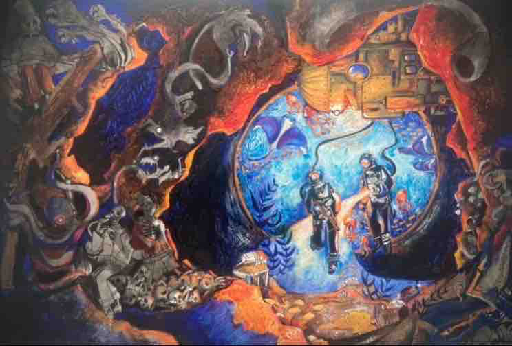 In this piece, I painted two deep-sea divers venturing into a surreal, almost otherworldly environment. I wanted to capture the tension between discovery and danger, blending the serenity of the ocean with a chaotic, almost nightmarish atmosphere. I tried to constrast the vivid blues of the water with the fiery reds and oranges, to a sense of conflict between the beauty of exploration and the lurking unknown. As I worked, I focused on layering details that make the scene feel alive yet unsettling—otherworldly creatures, skeletal figures, and a distorted landscape that hints at the divers stepping into a reality far from their own.