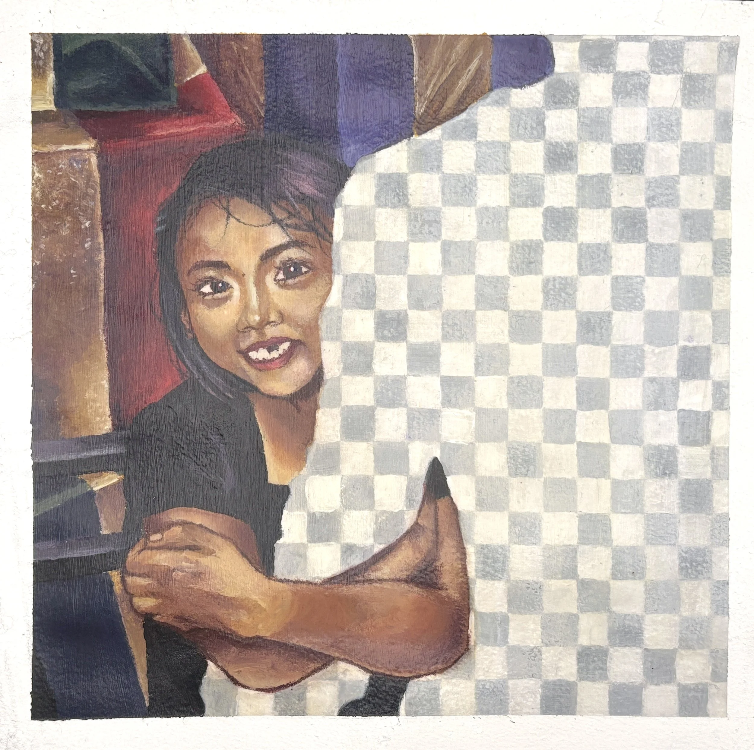 This piece was made with the intention of capturing how I view childhood experiences that I often feel nostalgic for. The original reference photo used for this was a childhood picture of me and my older brother; upon seeing this photo along with many others, I find myself feeling nostalgic even though our bond at the time was worse than rocky. I wanted to capture this feeling of nostalgia being a veil by cropping the photo and replacing his silhouette with a transparent grid, representing how I grew up without a role-model unlike my friends with siblings of their own. I would also like to mention that our bond now is much healthier now that we’ve grown up, yet I still find myself blinded by childhood memories.