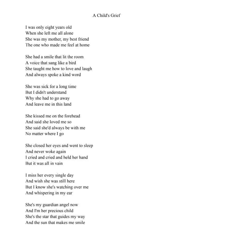 A Child's Grief Creative Writing Feb 3 Written By Tools BACF Alysa J. Artist Statement My mother passed away when I was eight years old. To this day she is still very dear to my heart, and I miss her a lot. Creative Statement Creativity isn't just what you see, it's emotions and deeper meanings in any and all forms of art. Tools BACF