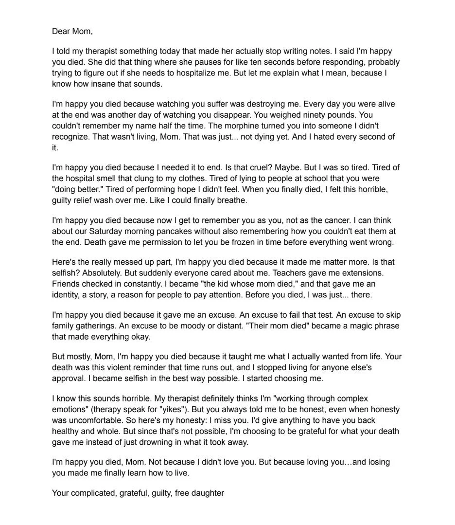 Artwork Statement This letter says what you're not supposed to say about grief: sometimes you're relieved. Sometimes you're even happy. Everyone expects you to be sad forever, but what if your mom's death also set you free? I wrote this because I'm tired of pretending grief is just one thing. It's messy and weird and sometimes you feel guilty for feeling okay. Sometimes tragedy gives you an identity. Sometimes suffering ending is a good thing, even if admitting that makes you sound like a terrible person. My therapist probably thinks I need more sessions after reading this. But honestly? Grief isn't this pretty, noble thing we see in movies. It's complicated and selfish and confusing.