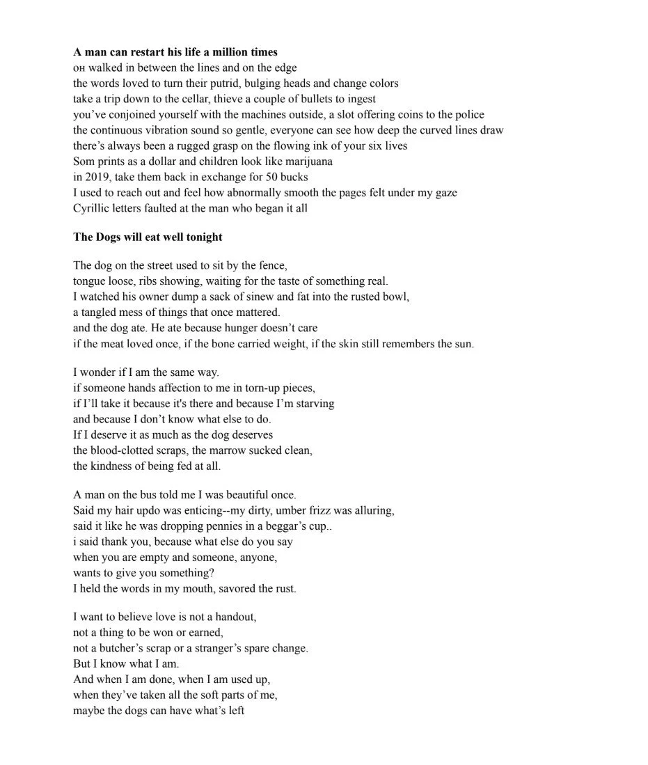 These are three separate poems that I worked on at different times to reflect on my childhood reaching an end. These works have allowed me to understand how my Uzbek ethnicity and my father's absence have impacted my life in ways I've previously overlooked.