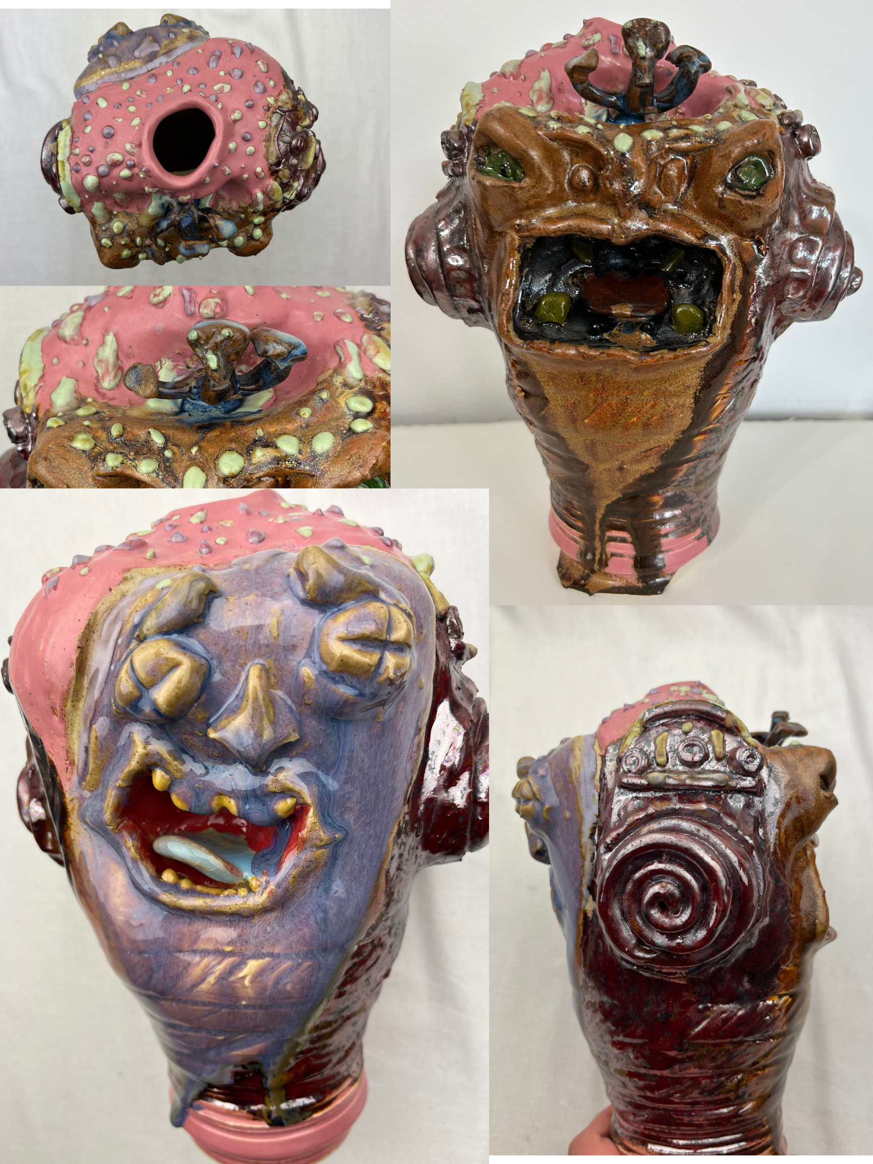 “Injustice anywhere is a threat to justice everywhere.” The words from Martin Luther King Junior’s Letter from Birmingham Prison I learned in my history class resonated with me for days. I began seeing just how potent oppression really is in my day-to-day life—how easy it is for a majority to corrupt a minority's joy and happiness. Inspired to represent my feelings of injustice into my work I impressed the face of a vase I was working on with my knuckle. Above the deep gouge I just created, I added eyes and a tongue with no specific imagery in my mind—I just was in the groove of creating. The face turned out pretty ugly. I molded it into a grotesque monster - the same monster that King wrote about: a majority oppressing minorities. To further illustrate the consequences of a majority’s oppression of minorities, I used color, geometric patterns, and physical extrusions.