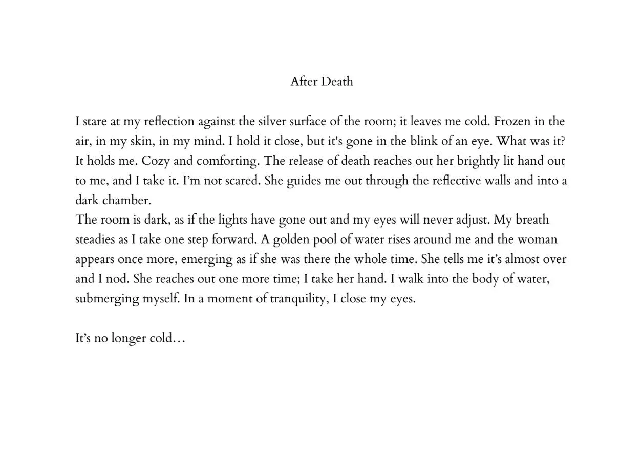 This piece was written to accommodate a piece of preexisting artwork that I wrote in my class in Marin School of the Arts. In pursuit of creating something that could respect it, I wrote something very personal to myself about letting go and accepting a fate fit for yourself. "After Death" encapsulates the feeling of letting go of yourself and what the journey a person has been on in order to finally feel and be free.