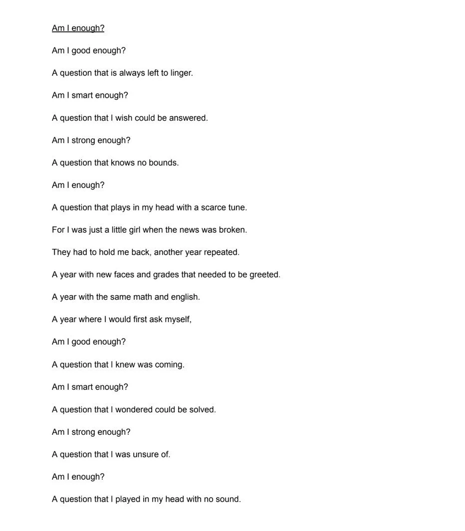 This was a short poem I've been wanting to write for a while now. Many people get held back in life. People repeat years of school, get stuck in a bad relationship, etc. Events like these that hold you back can cause you to question your self worth. In my case it caused me to ask, "Am I good enough?". This poem of mine explores my feeling after I was held back in school and the after effect it has had on my life in general. I hope this poem can find people who have asked the same pressing question and give them someone to relate to. Thank you for reading this poem, I hope you like it!