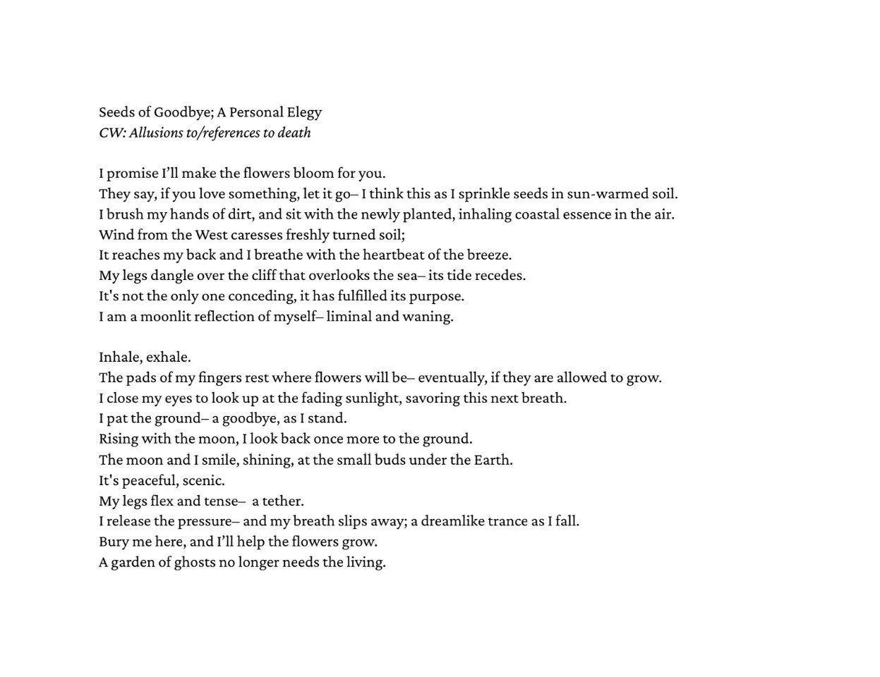 I write every day. Not for class, not for assigned rubrics– but for me. My collection, “Autopsy of an Artist”, showcases my art style, personal voice, what I’ve been proud of writing to express what I want– and more importantly what I need to. These pieces aren’t inspired by specific moments, but instead are windows into my ranting; raw, inner monologues using my preferred metaphors to explore and process the intricate, often fragile interrelationships humanity creates between conceptual thought and a natural world we cannot control. These convey my observations and obsessions with the complexities of human nature, psyche, and identity; particularly the condition of being human and the mortality of our minds. I find that compounding breaking points and renewal offers a delicious combination of source material from which to draw readers in with impactful imagery, leaving them comforted, confronted, devastated, disturbed, or curious to explore these thoughts themselves.