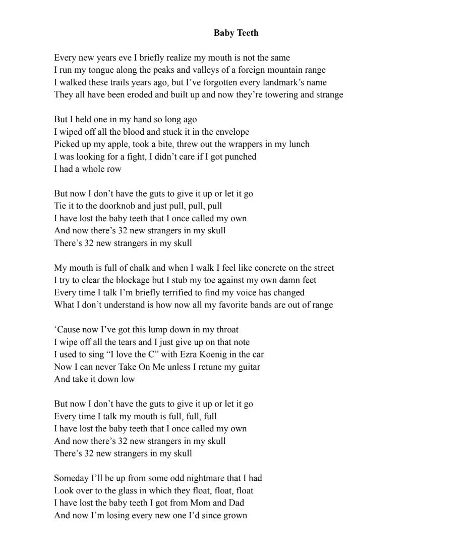 I wrote this song about growing up, and realizing just how much I've changed. I was interested in baby teeth as something nostalgic and pure, but also symbolic of growing up and permanently leaving things behind. While the song started in a place of denial, I came to accept what I've lost growing up and cherish what I've gained. Musically, I wanted this song to be bare-bones, and showcase the imperfections in my voice, which I reference in the lyrics. I was especially proud of the chorus, and the idea of my teeth as new, and eventually kind strangers, just like any change in life.