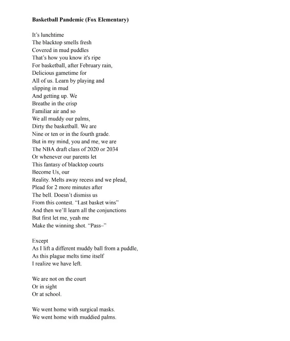 I wrote "Basketball Pandemic" while reflecting on my love for basketball and its lasting effect on my identity. Eventually, I realized that the COVID pandemic changed my relationship with the game. Through this poem, I wanted to express the sheer impact of the pandemic on my friends and I and our perseverance, which was often tied to sports. I wrote this poem sitting next to my basketball hoop at home.