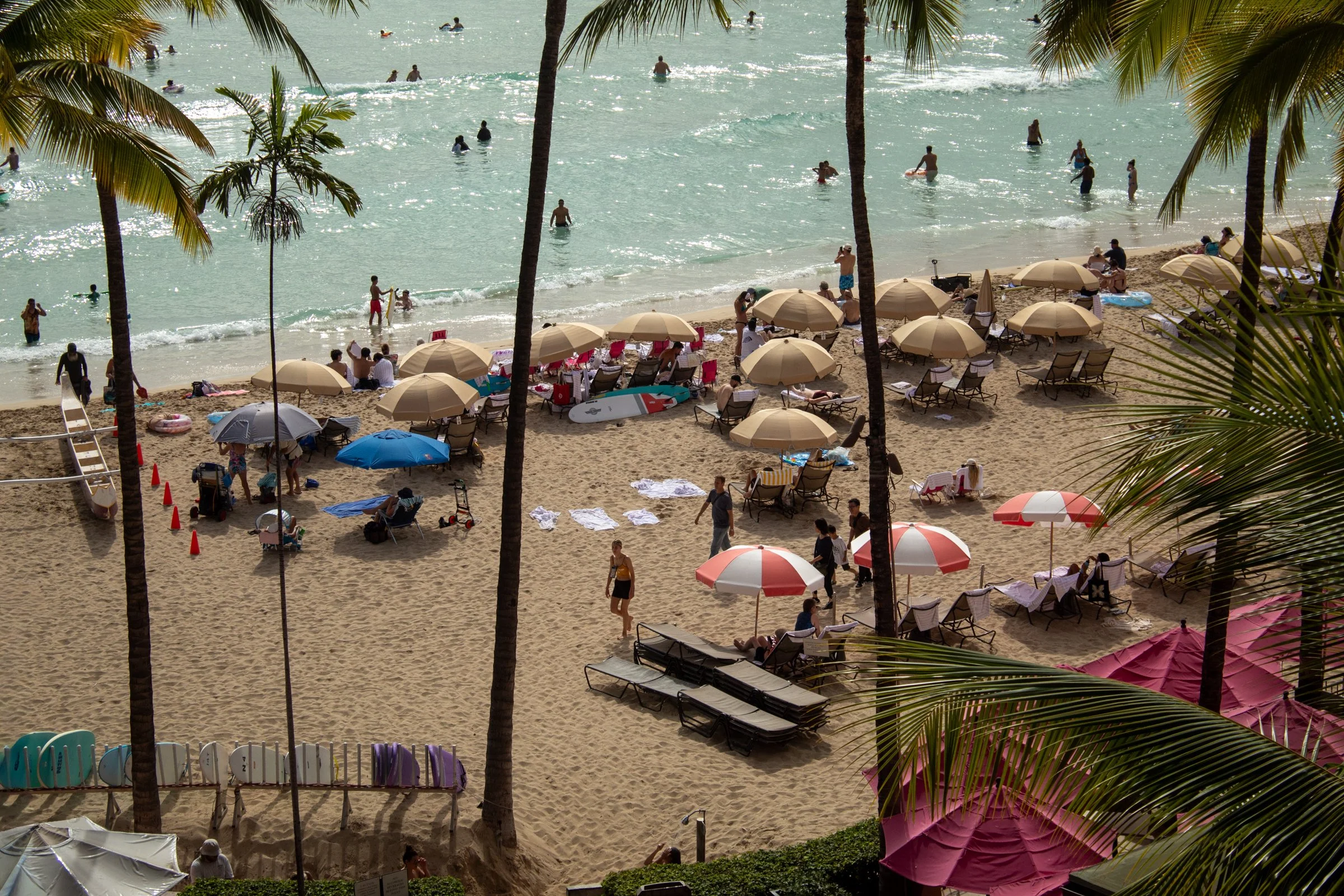This image is shot looking down at a bustling beach in Waikiki. It shows the lives of people swimming in the ocean, basking in the sun, or taking a shower after a long day in the salt water.