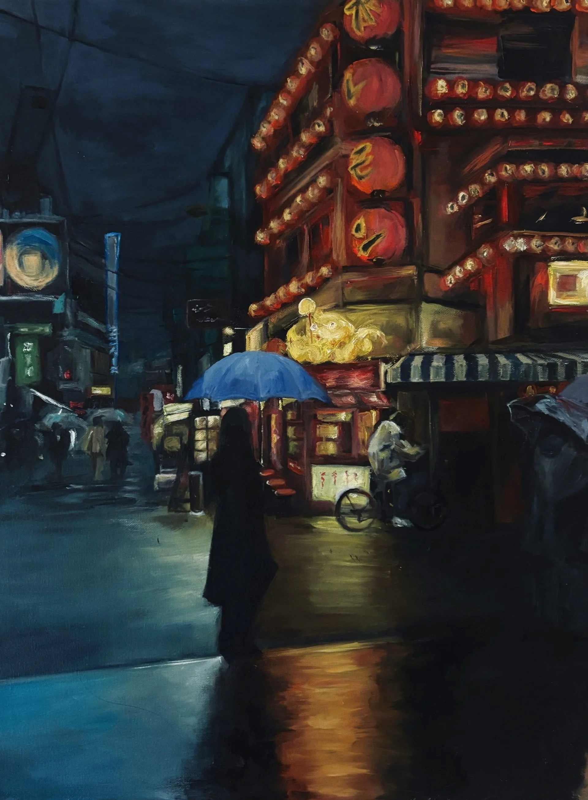 This painting captures a moment on a rainy night in Osaka, Japan, where a girl with an umbrella stands between two distinct landscapes: the modern streets, glowing with cool, blue-green neon lights, and the traditional world, illuminated by red lanterns and warm lights. She exists in the space between these lights, eras, and hours.