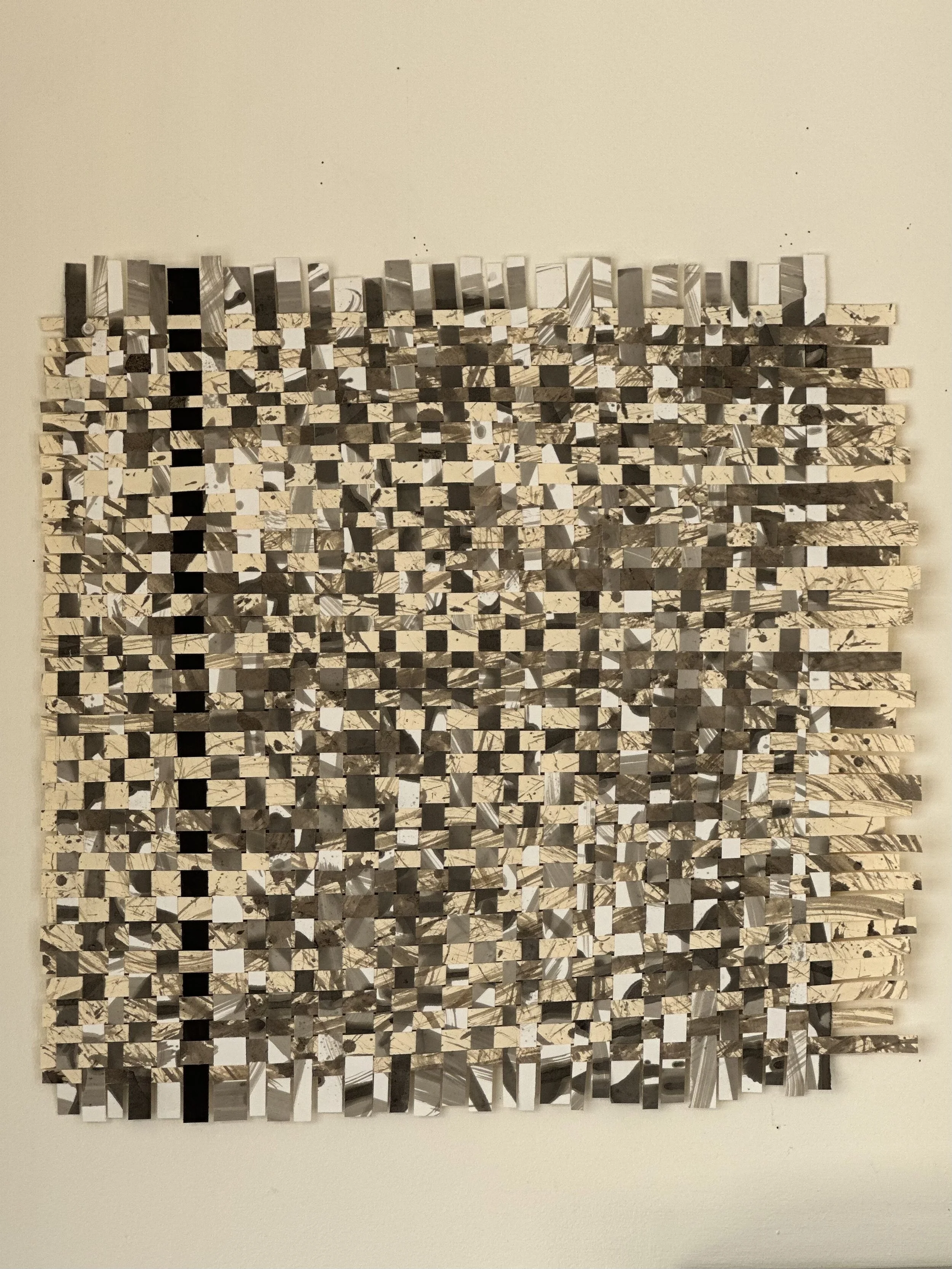 This woven piece is made from two papers each splattered with homemade by me iron gall ink. The papers were painted with tools that were made by myself, all from natural materials. From the ink to the tools, to the weaving, this has been a creative and spontaneous process that captures connection.