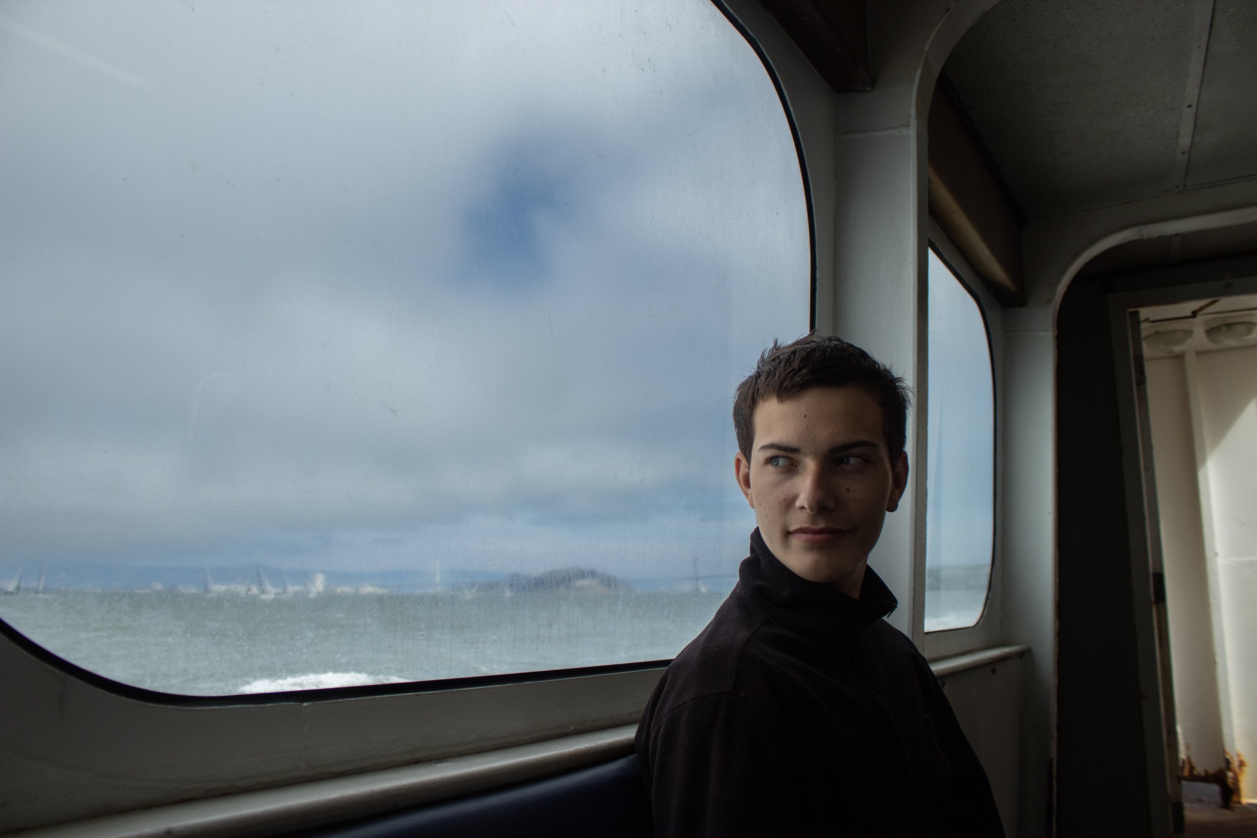 This is my friend and I on our way to the Palace of Fine Arts in San Francisco on the Bay ferry. I brought my camera to document the trip and take photos of him in different environments.