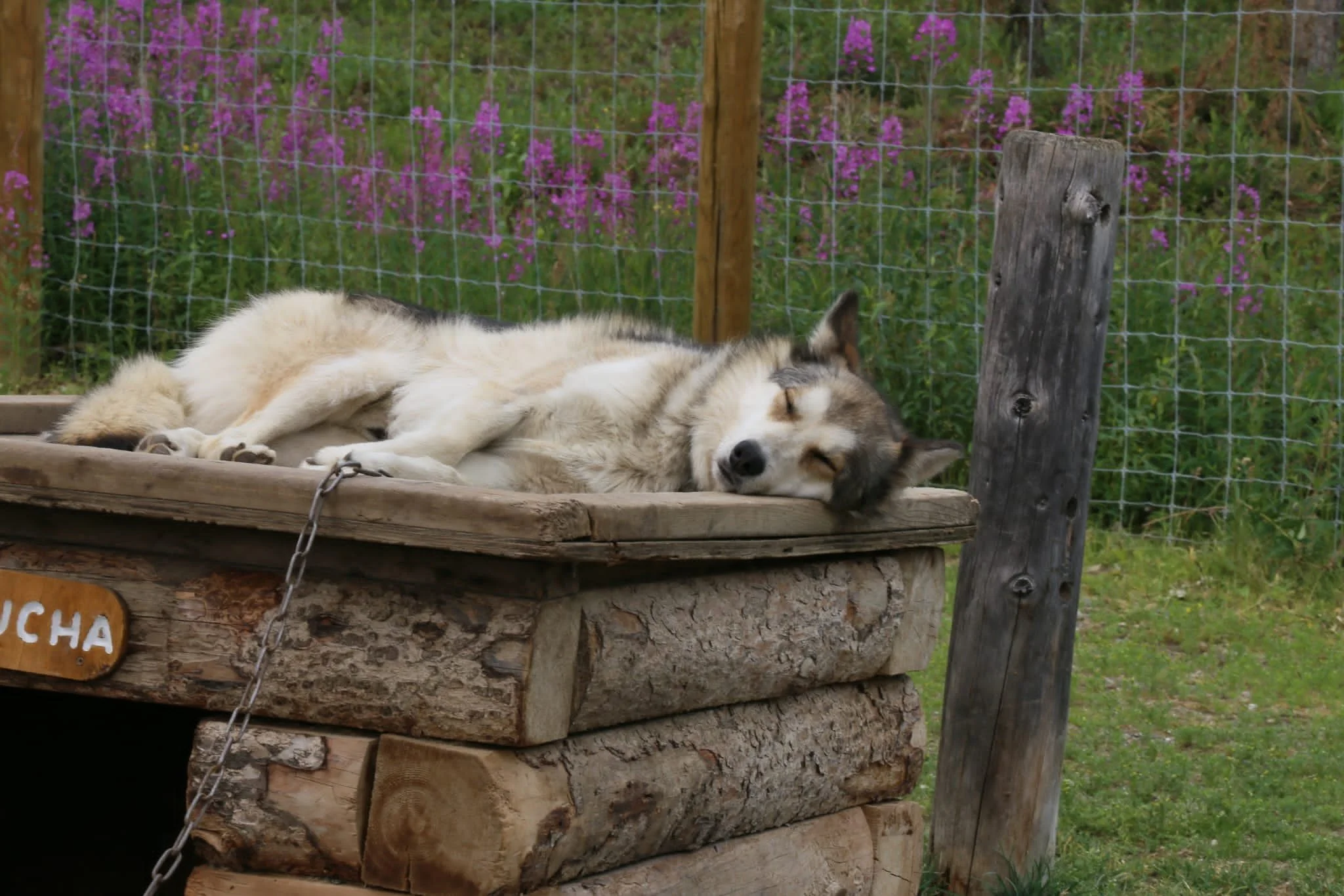 Many dogs in Alaska are used as sled dogs, and I wanted to capture this dog's moment of rest in its long days.