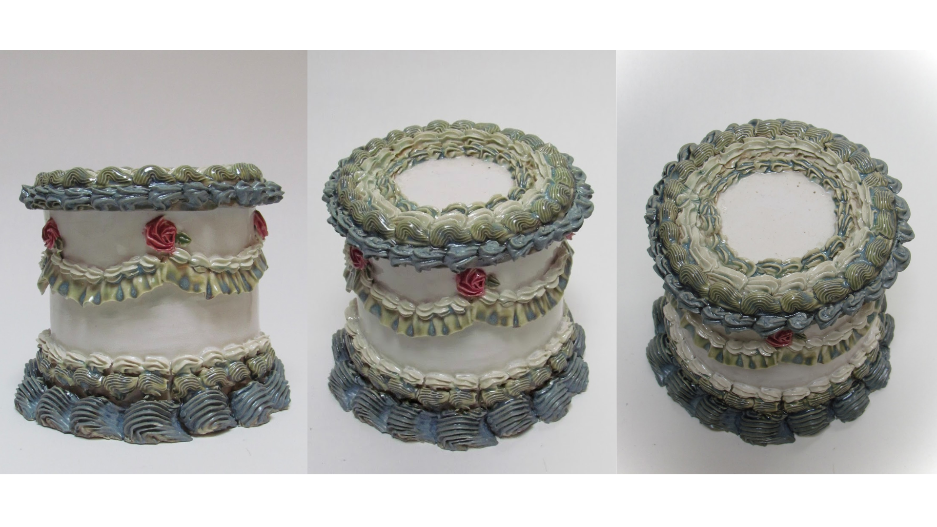 This artwork was inspired by my love for cake decorating. I wanted to create a permanent cake, so I used slip to create frosting and used my piping bags and tips. I turned it into a little jar so now I keep my trinkets in it.