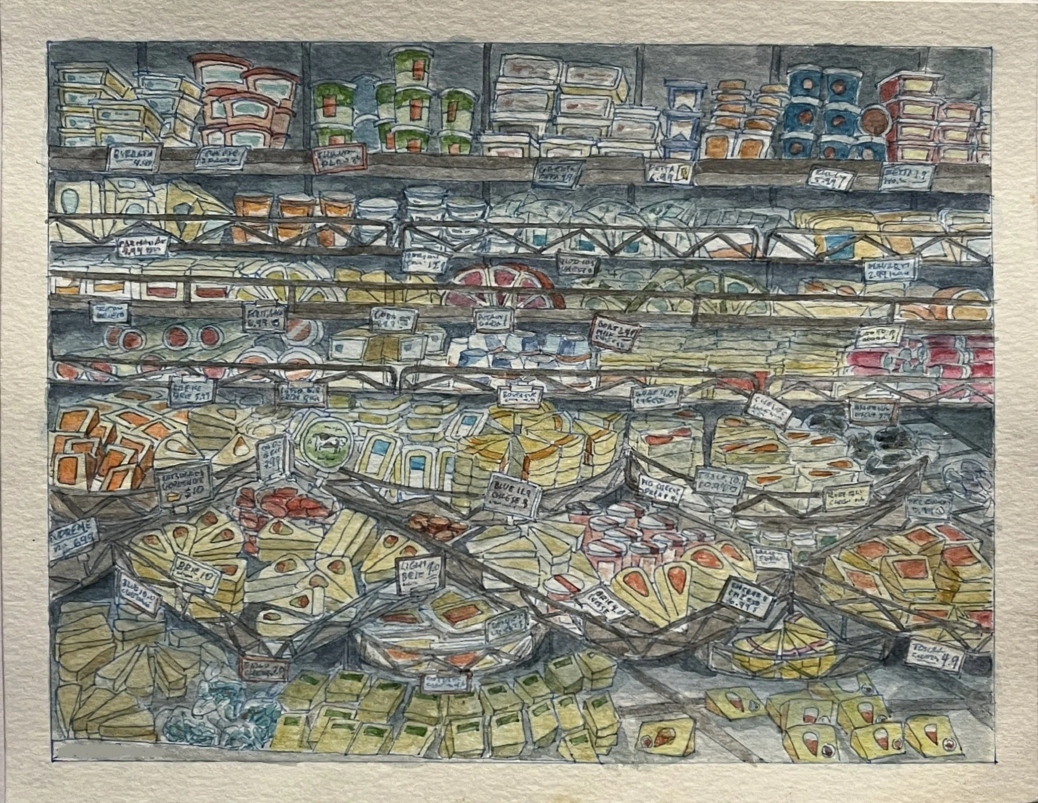 My painting is of a cheese aisle in a grocery store. I wanted to capture the meticulous work it must have taken to stock the shelves, and how intricate the aisles are.