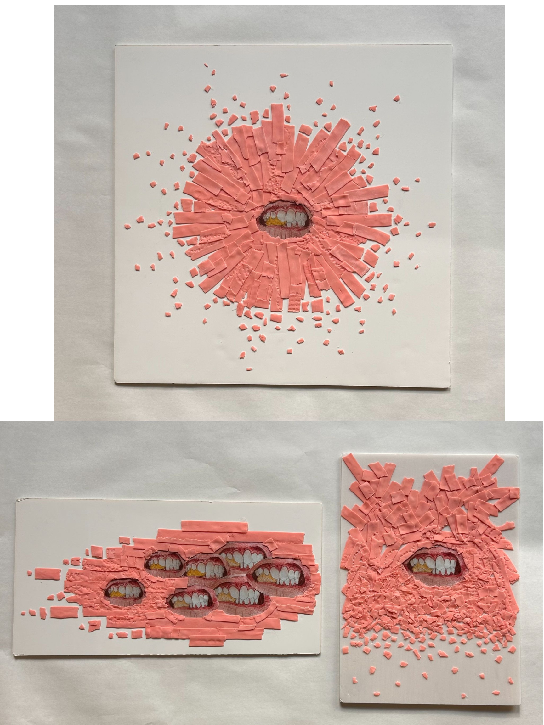 I wanted to emulate anxiety through the sensory-focused medium of chewing gum. I chose gum because it’s a personal expression of anxiety for me and a physical coping mechanism that many of my peers could relate to as well. I aimed to create a sense of chaos and disarray by layering the gum pieces, using different sizes and shapes, and varying the textures by chewing them. I also tried to suggest motion, mirroring the constant chewing associated with anxiety, by creating a gradient from large pieces of gum to small torn fragments. The clenched teeth centered in each piece further reinforces the feeling of anxiety.