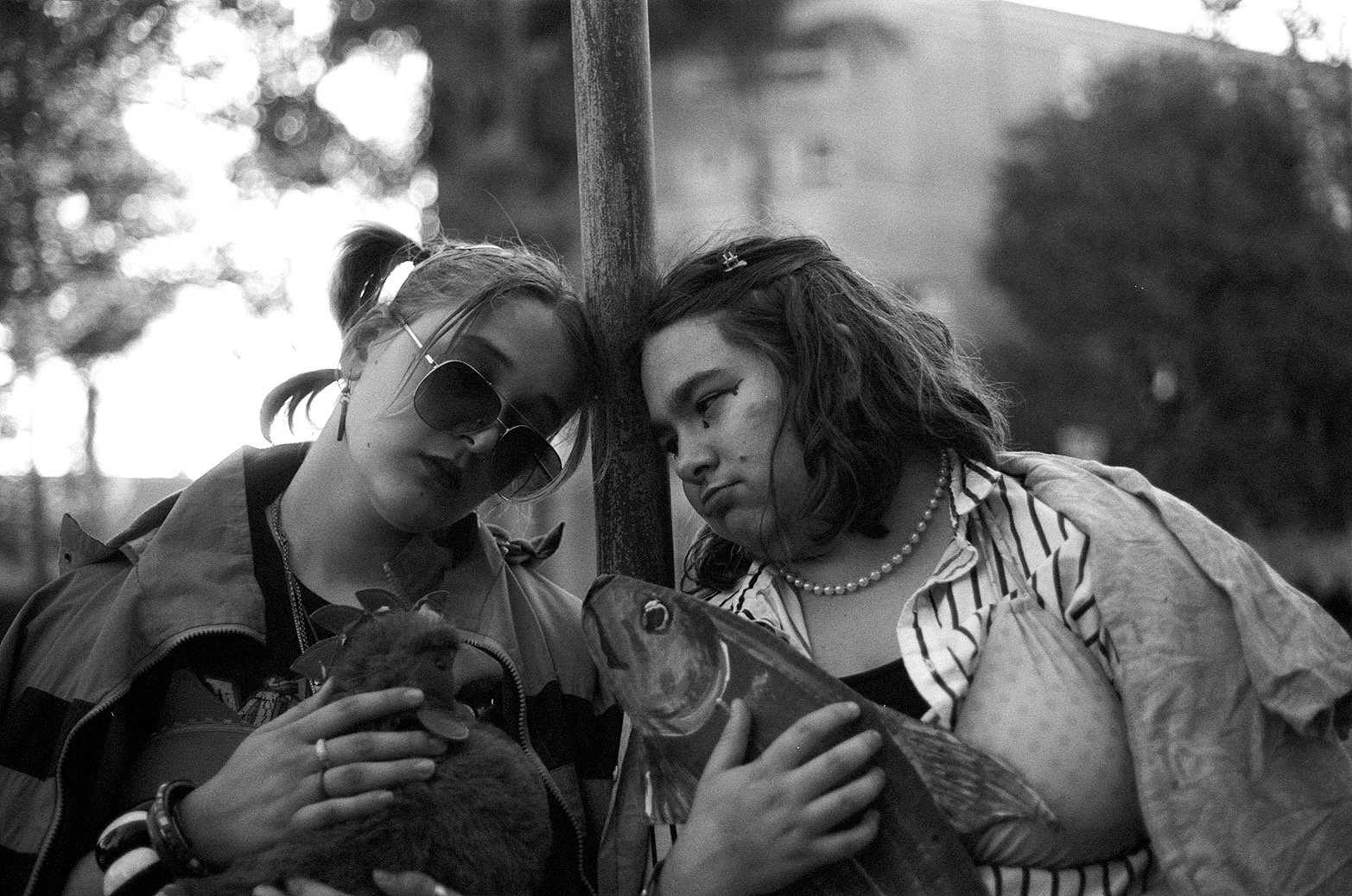 This is a photograph I took of two of my best friends a couple of months ago. In it, they are seen leaning against a telephone poll, clutching their respective stuffed animals. I tried to depict a feeling of imagination and make-believe, using nonsensical props and costumes.