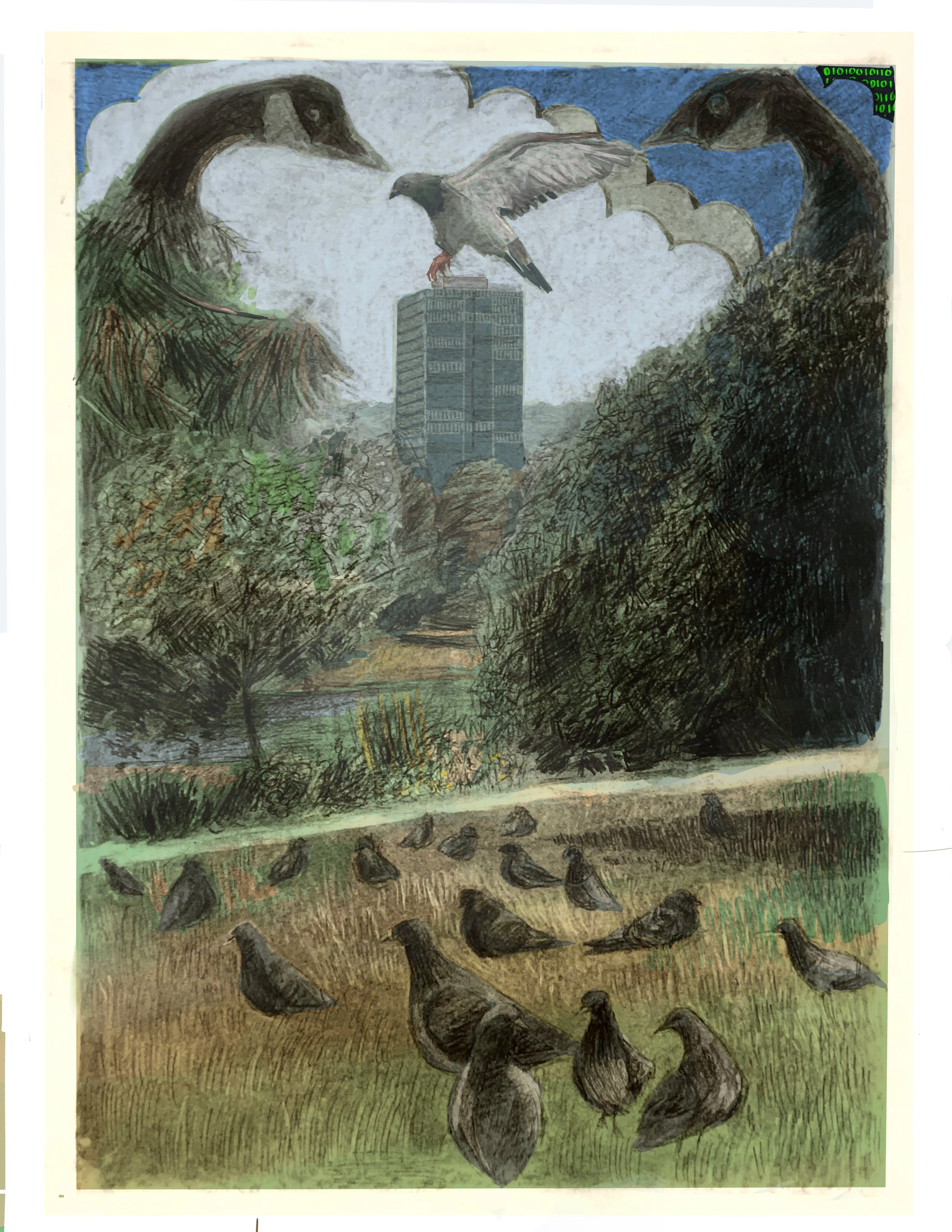 This artwork is showing the park that me and my friends would hang out at during middle school. We always had a lot of fun, and would always climb the trees. I’ve always had a strong connection to pigeons, and they also really enjoy the park around Lake Merritt. I have also had the same situation with swans, but I don’t like them. I drew from a set of photos including a lot of different pigeons and two swans. I drew them on top of my photo of snow park, and did it in charcoal on an 18 by 24 paper, then colored the photo digitally on procreate.