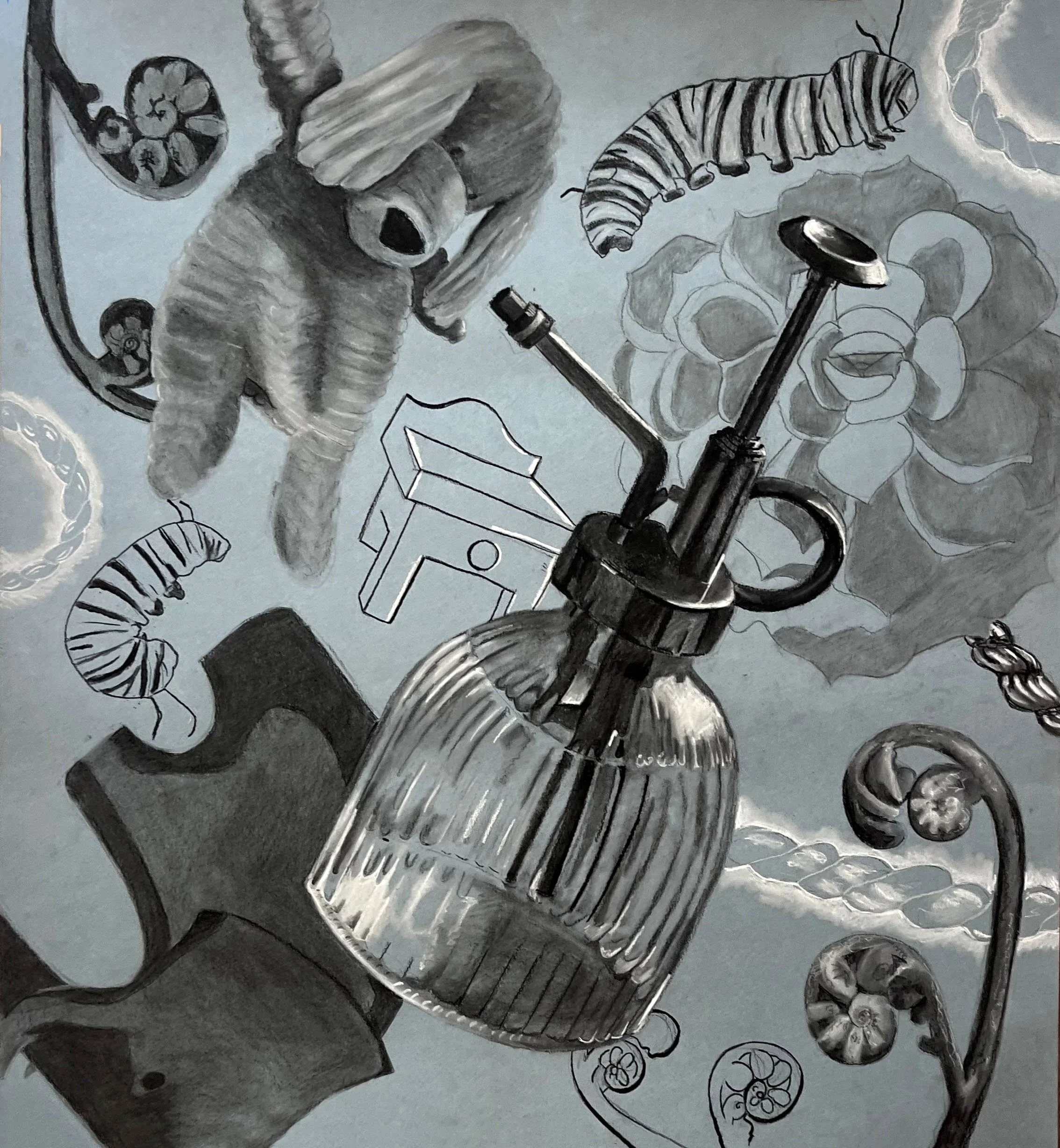 This is a collection of items that show what childhood means to me. The bracelet chains, glass water squirter, dollhouse table, wooden elephant, and stuffed dog have been passed down to me from my mom. Ferns, plants, and caterpillars provide a little more of who I am now, that I have grown and changed, but that I am also still undergoing change. Showing that I am still unfurling, discovering who I am and my place in society. The overlap in the drawing between the items from my mom and the natural elements show how I am a collection of my past and the space I have to grow.