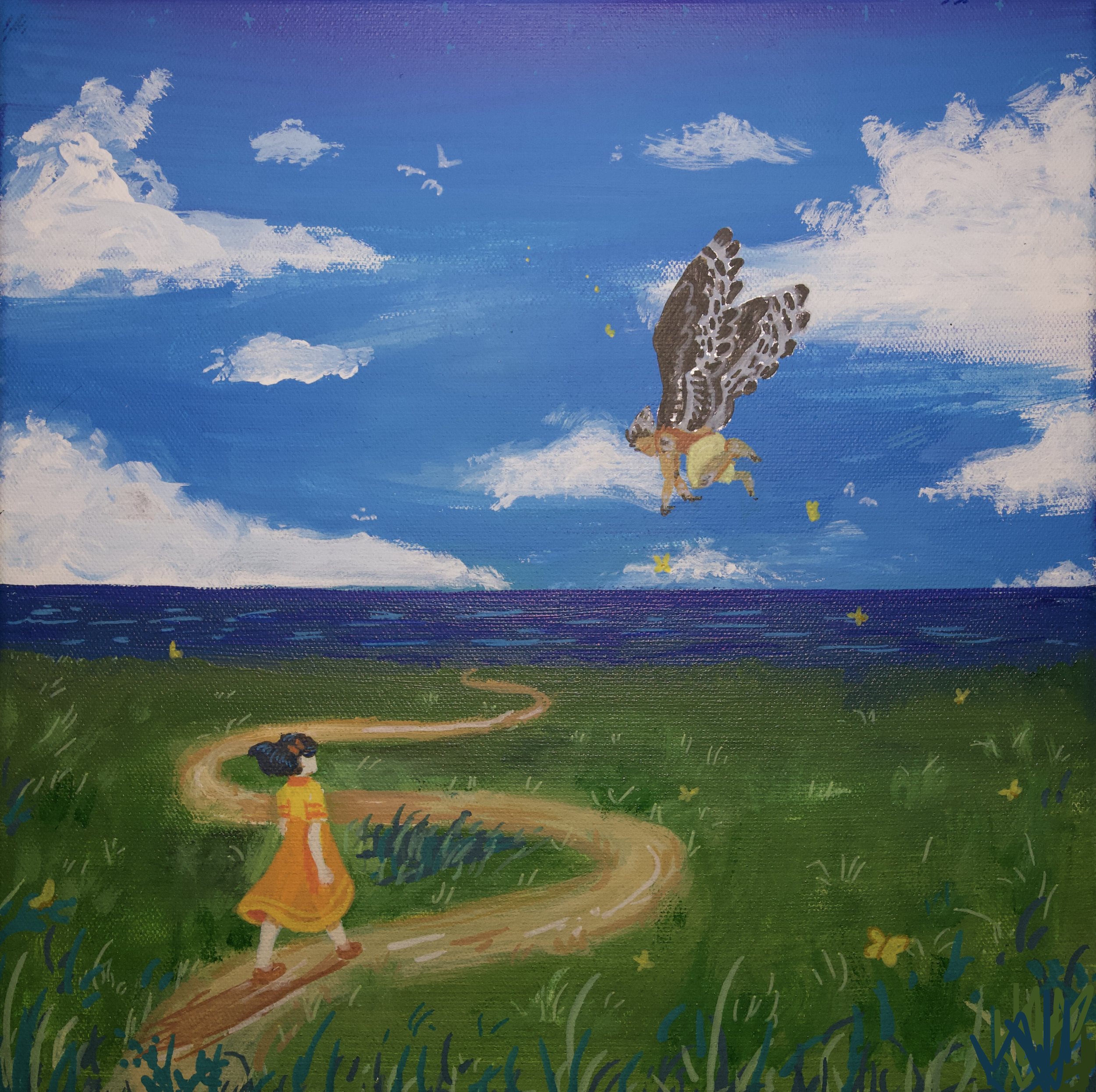 This painting shows the call to the unknown. The girl on the ground has befriended someone new, whose nature encourages her on to the vast oceans before her. On the winding path, over the cliffs, and across the ocean lies a lifetime of fear, love, and growth. Will she be brave enough to take on the adventure that is life?