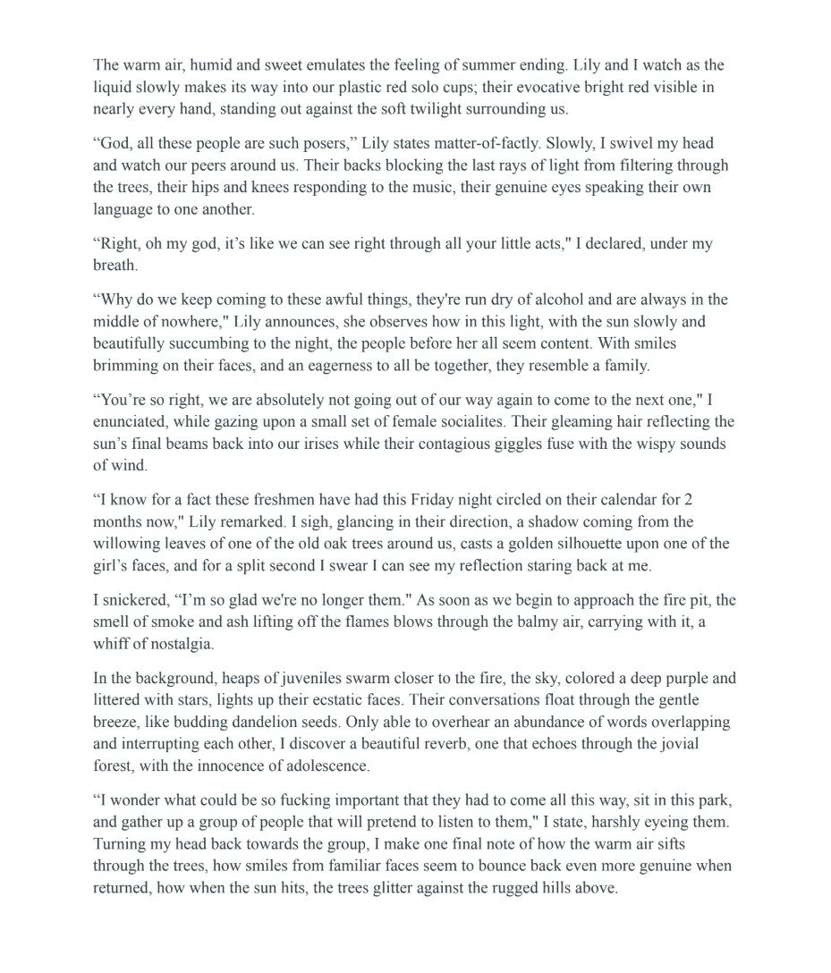 This piece is a illustration of a very familias anr experience for Bay Area teenagers. It symbolizes the stark contrast between people's words their true internal emotions. When creating this piece, I wanted to reflect on the artificial nature of the people I have been surrounded with my entire adolescence also wanted to shed light onto how most teenagers, though they outwardly detest those who are younger, more innocent and freer that them, internally they yearn and crave for those feelings of contentment and community that childhood afforded them. Though this piece may contain graphic language and illegal activities, such as underage drinking, I wanted the voice of the piece to be raw and convey an accurate depiction of Bay Area juveniles.