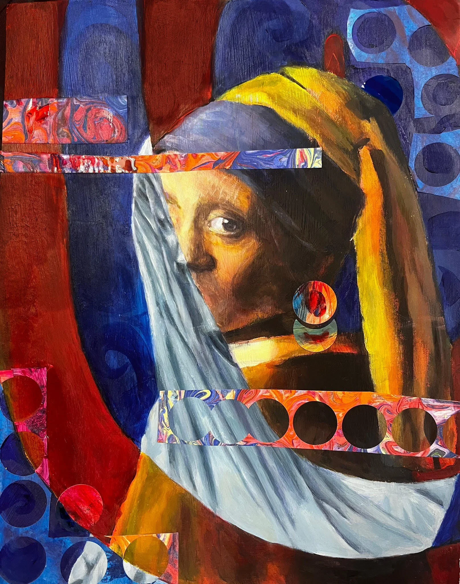 Dating back centuries, women have been idealized through art, but through that process they are removed of the very thing that makes them who they are; they are removed of their autonomy, their faults, their humanity. The Veiled Virgin, painted in the blue sections, depicts Mary as a beautiful mysterious figure, but restricts her to an image of purity, virginity, and connection to men. Combined with Mary, together in their experience regardless of their differences, is the Girl with the Pearl Earring. This painting similarly traps its model in this image, an image of beauty and mystery. She is loved for beauty, but her humanity is lost. To show this loss of self, her features are painted as slowly disappearing with her. The pearl earring still remains however, but in its own form: colorful and expressive, containing a fingerprint in the center, valuing her humanity over her elegance.