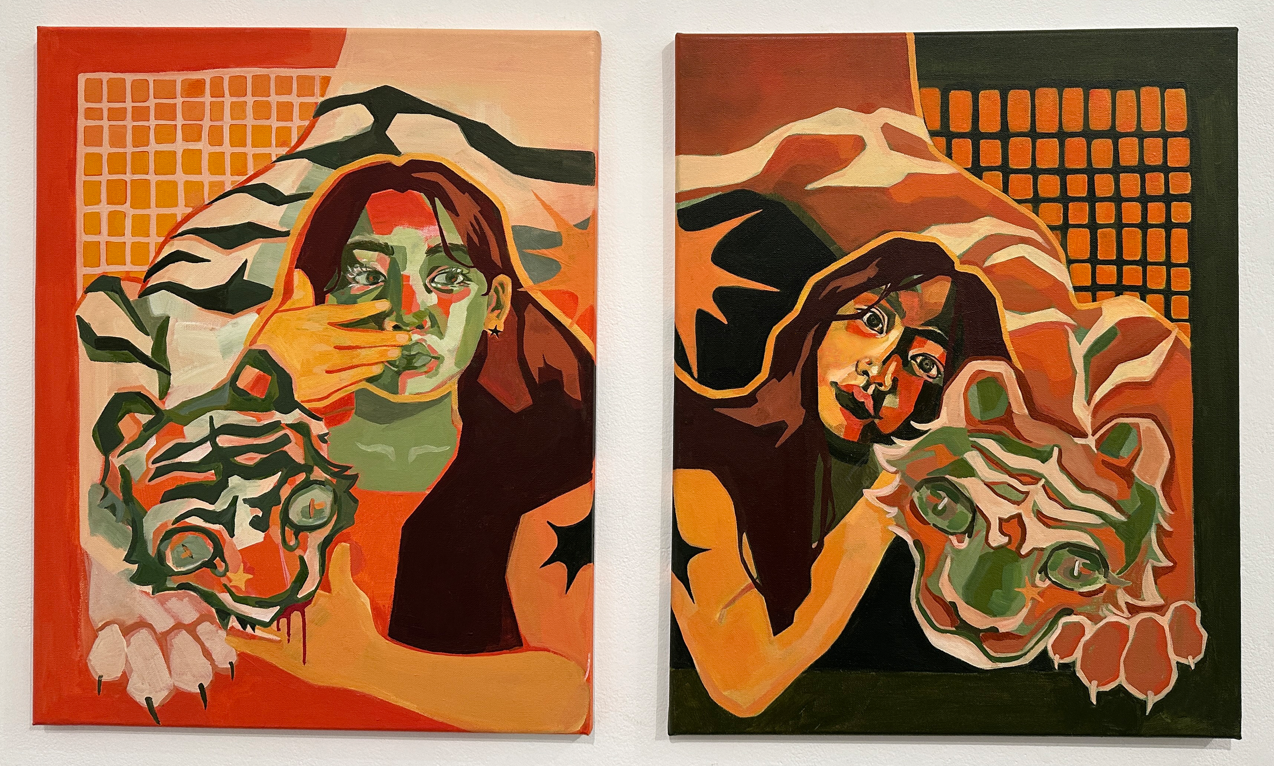 This diptych holds a lot of personal meaning: it encapsulates the two conditions I often find myself in. The first (left panel) is a state of self-sabotage and lack of confidence, where I feel the need to cover up and avoid eye contact with the outside world. Here, I speak down to myself, and my negativity becomes a tiger, drawing blood. On the other hand, the second panel depicts a state of tranquility where I am at peace with my tiger, which is no longer negativity, but self-worth. I stare straight into the camera, drawing strength from an inner well of confidence. I've learnt to live with my tiger.