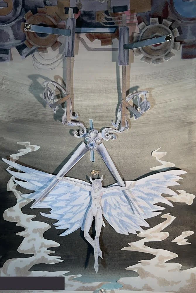 The piece depicts an angel having its wings cut off, causing them to fall down into the sky and reach earth. Heaven and angels are shown to be mechanical, all joined together in a big machine, showing that angels and heaven do not truly have free will. The angel is shown more human like and without connection to heaven, showing that with their new identity as a human they will gain free will. In the continuation of this story, the angel lives a fulfilling life as a human full of choices, both positive and negative, as a result of their new free will. When it is time for them to pass away, they will be visited by an angel of death and judgement, where the once angel will in death be judged as a human.
