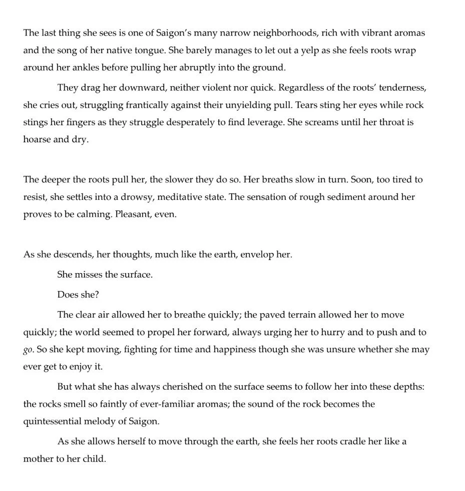 This work was an attempt to explore my roots through a literary lens. I incorporated my father's birthplace: Saigon, Vietnam to give some familiarity and realism to a very bizarre and unreal scenario.