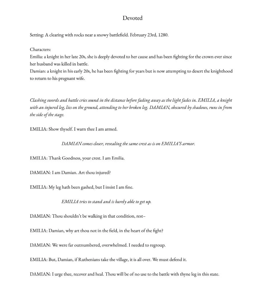 “Devoted” was a play originally written with a partner for a program with a local theatre company that fosters youth creativity. It was ten minutes in length, as the program required, and was produced by local, professional actors. I feel a strong connection to these characters and the themes of how devotion and loyalty manifests, and this play was a joy to write and develop. And so, even after its production, I felt I was not finished with this play, and decided to continue its evolution solo. I am incredibly proud of the final product, and I hope readers love and resonate as much with it as I do.