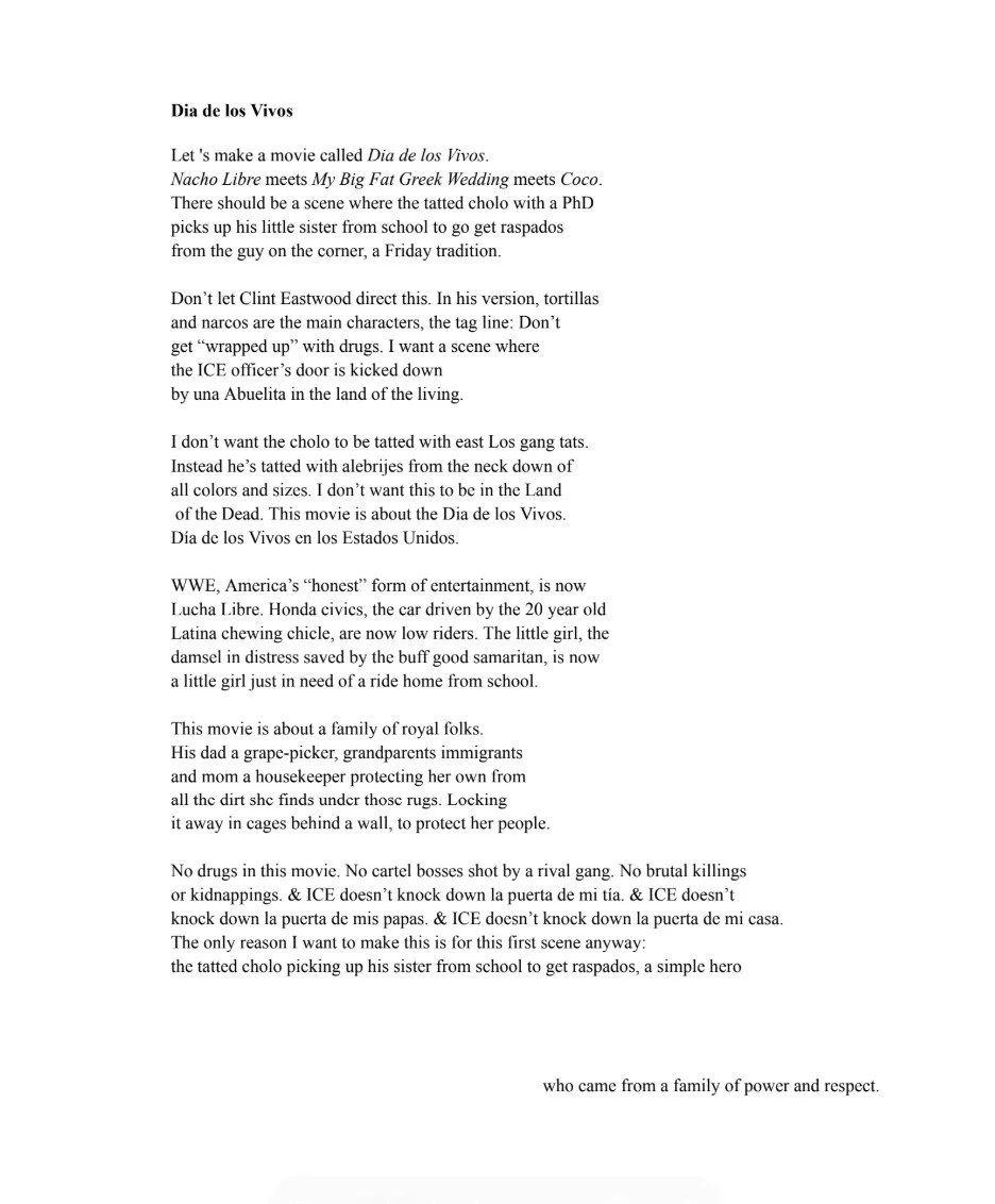 I chose to imitate several parts from my mentor poem, Dinosaurs in the Hood by Danez Smith. I used the idea of stereotypes and flipped the “typical” protagonist into one that is reflective of a community, previously depicted as antagonists in the media. I imitated the original poem’s description of the first scene, and made it into my own version of how I want the “cholo” to be portrayed as the hero. In Smith’s poem, they used a simpler and more innocent scene to begin the poem, but I used this as inspiration to create a scene that is both relatable and rare. I also used Smith’s idea of combining elements of different movies to create an original piece, free from the common clíches found in media. I believe by combining these opposing movies we can create creative and unconventional scenes, never seen in the media, and form new narratives.