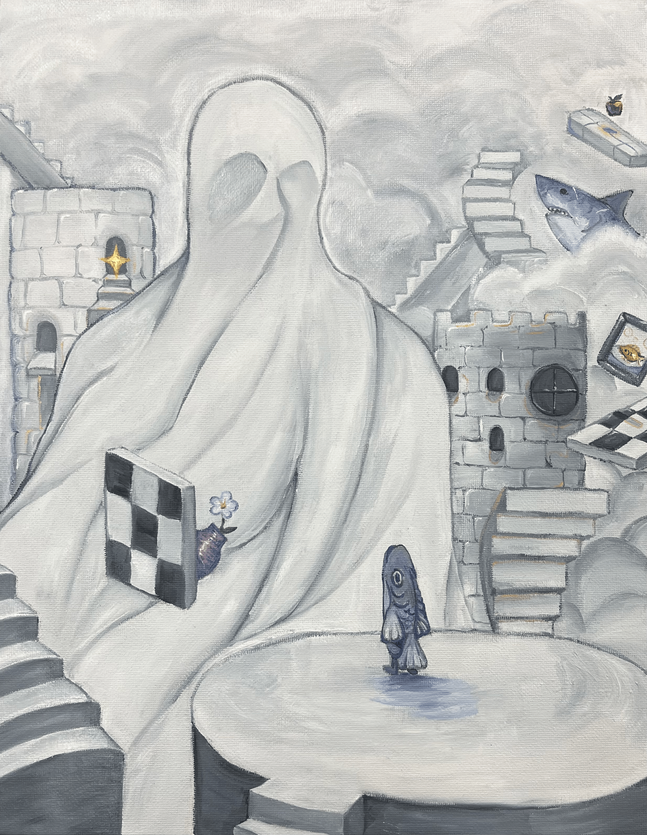 I wanted to depict a discovery of oneself through my artwork. The exploration of trying to find who you are is difficult. There isn't just one path, but many, and to depict that I painted many stairways to different paths. The cloaked figure is meant to represent the you who hasn't been discovered yet. Overall, this painting was a representation of those who haven't been able to discover themselves yet.