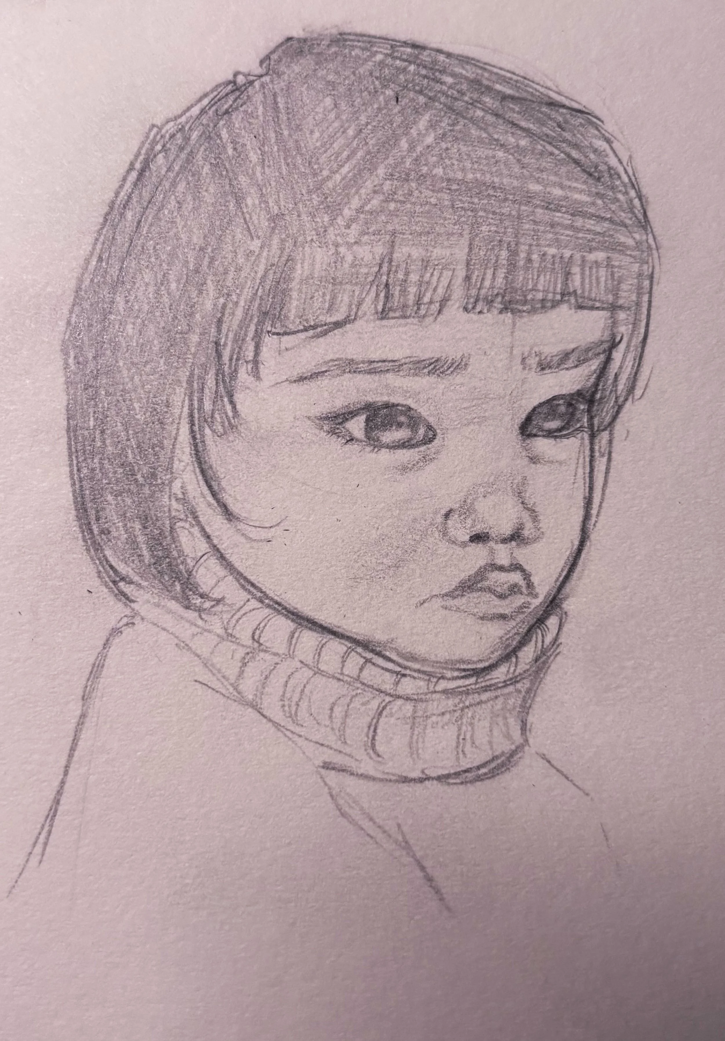Upon looking for a drawing reference, I saw a drawing of a young girl. The sad look in her eyes instantly made me want to draw her. I wanted the challenge of incapsulating the feelings in the girls eyes. I sat down at my desk turned, on my light, and as I drew, I tried my best to channel the girl's intense feelings through me on to my paper.
