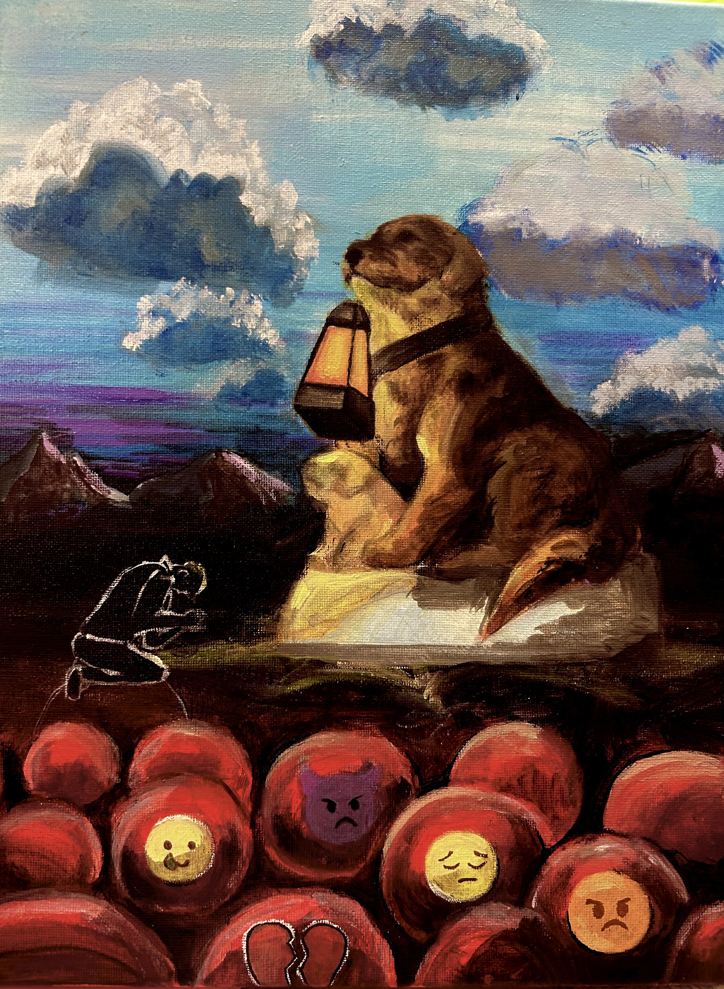 This piece reflects the darkest time I’ve experienced. This year, everything fell apart—stress, depression, and breakups all stacking. Amid the chaos, my dog became my light. Every night, she slept beside me, grounding me when nothing else could. In this painting, I kneel before a statue of my dog holding a lantern—a symbol of the light she gave me when I couldn’t find my own. The lantern represents comfort, guidance, and hope, illuminating the space around her even as darkness overtook below. The crowd of red orbs painted with different emojis, represents the flood of stress, anger, heartbreak, and confusion that filled my mind. The statue conveys the reverenceI felt in her presence—as if she were something holy/eternal I could turn to when everything else felt temporary. This piece expresses quiet ways love can save you, even when it comes from a creature who can’t speak.