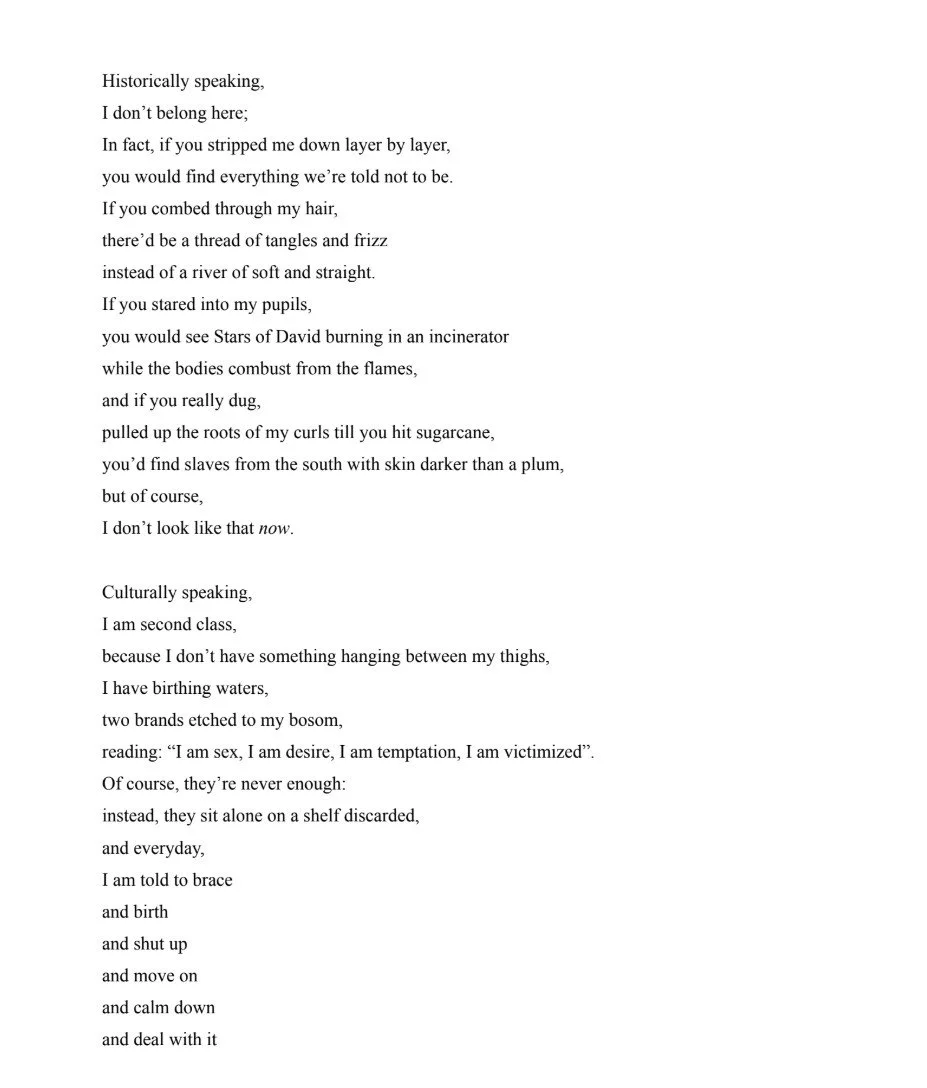 “Drifter” is both an elegy and a love letter. As difficult as it has been for me to build my identity and feel as though I belong, journeying with myself, family, friends, and other mentors in my life was, and continues to be, a labor of love. Finding the courage to utter fear or anger or any rebuttal towards institutionalized expectations took me quite some time to put to words, yet feels so powerful. I wrote the first draft of this poem with my Mom and Nana in mind, who are both “passe-blanc”, and built upon their shared unease surrounding their racial, ethnic, and everyday identity. “Drifter” started for them, then metamorphosed into a therapeutic release for myself, and is now for anyone else: it’s a weathered life line for those that are feeling or have felt or fear they will feel like they do not belong.