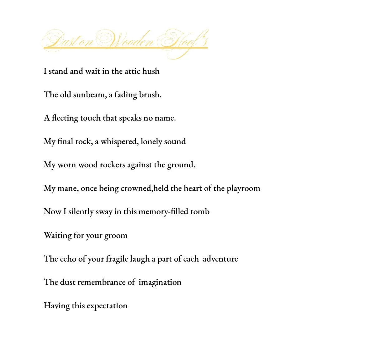 Artists statement: This piece explores the loud silence of the parts of our lives which grow quiet as we age. This idea is explored through the light of wooden rockers. It describes how our childhood belongings hold onto echoes of joy long after they are put out of use. Ultimately, the story influences its audience to think upon the impact these belongings have on them even in their earliest world.