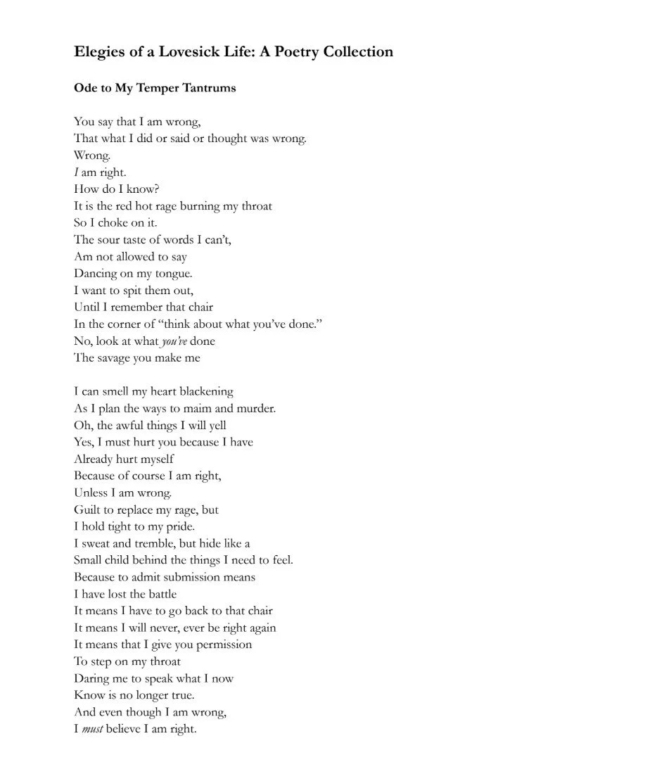 Elegies of a Lovesick Life: A Poetry Collection is a compilation of three poems, each one reflecting a difficult aspect of the teen experience. Whether it’s the false belief that being wrong in an argument makes you weak, the realization that not all love can/should be chased, or the heartbreak that even the smallest of commas can bring, I have strived to represent the unseen struggles of our age group. Oftentimes, the adults and role models in our lives never see the silent pains of growing up, because frankly, they are just not us. Hours and hours of revising, inspiration, and arduous everyday experiences went into these three poems. As you read these emotional poems, keep in the back of your mind this notion: youth is not the absence of understanding, but merely a different kind.