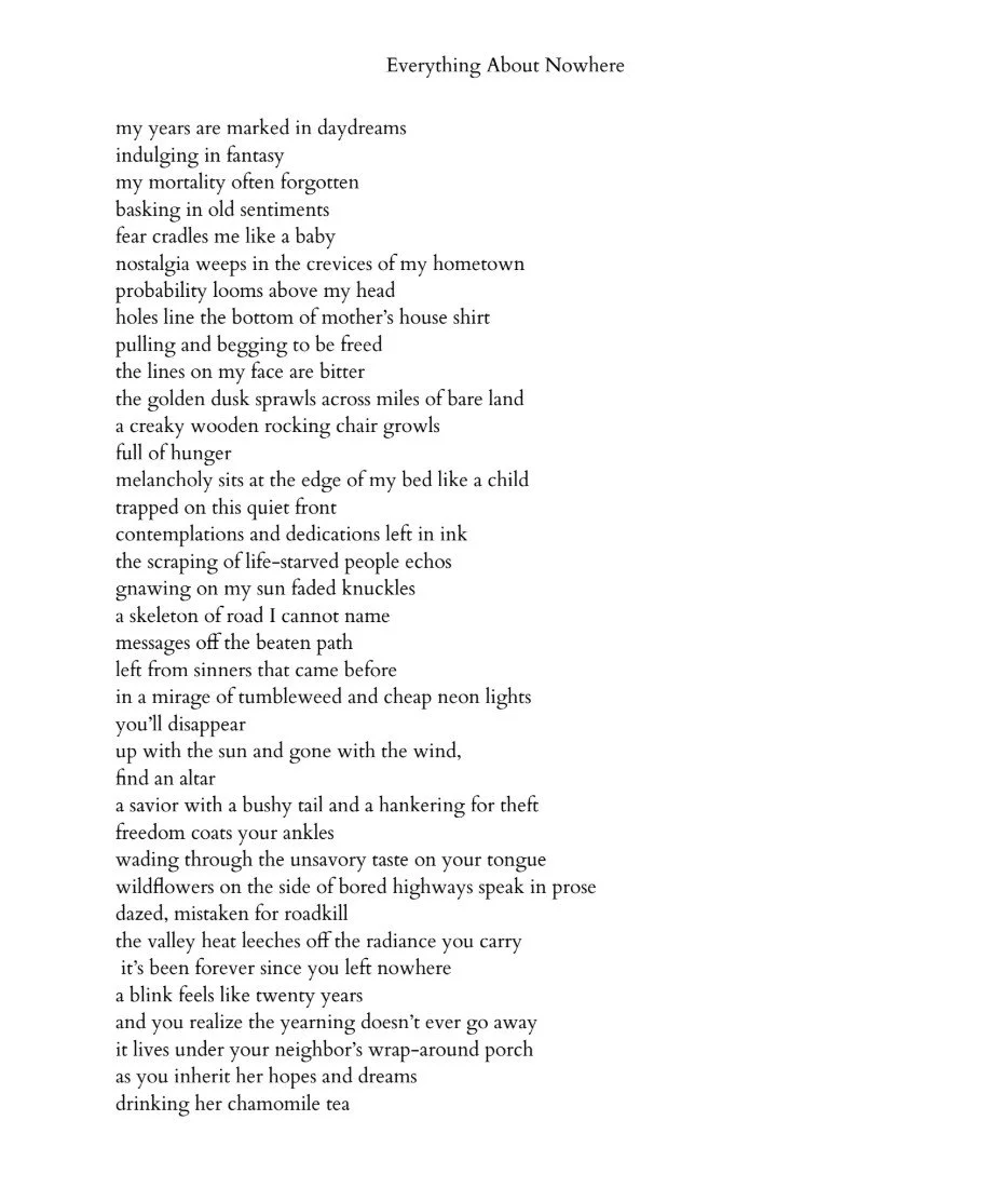 My dad grew up in the rural pit of California, and is an avid story teller. My bedtime stories were shaped by the memories of his life in the central valley. This poem is inspired by the descriptions of these moments. I’ve always had a strong artistic connection with my dad, as he’s always had a story inside of him. His vivid imagination and ability to evoke emotion in words has been a talent kept hidden. I write with the bravery he never had — the bravery to share my work with the world. This poem is a reflection of the past that not only shaped his upbringing, but also my own. The valley of stories will always be home for us.