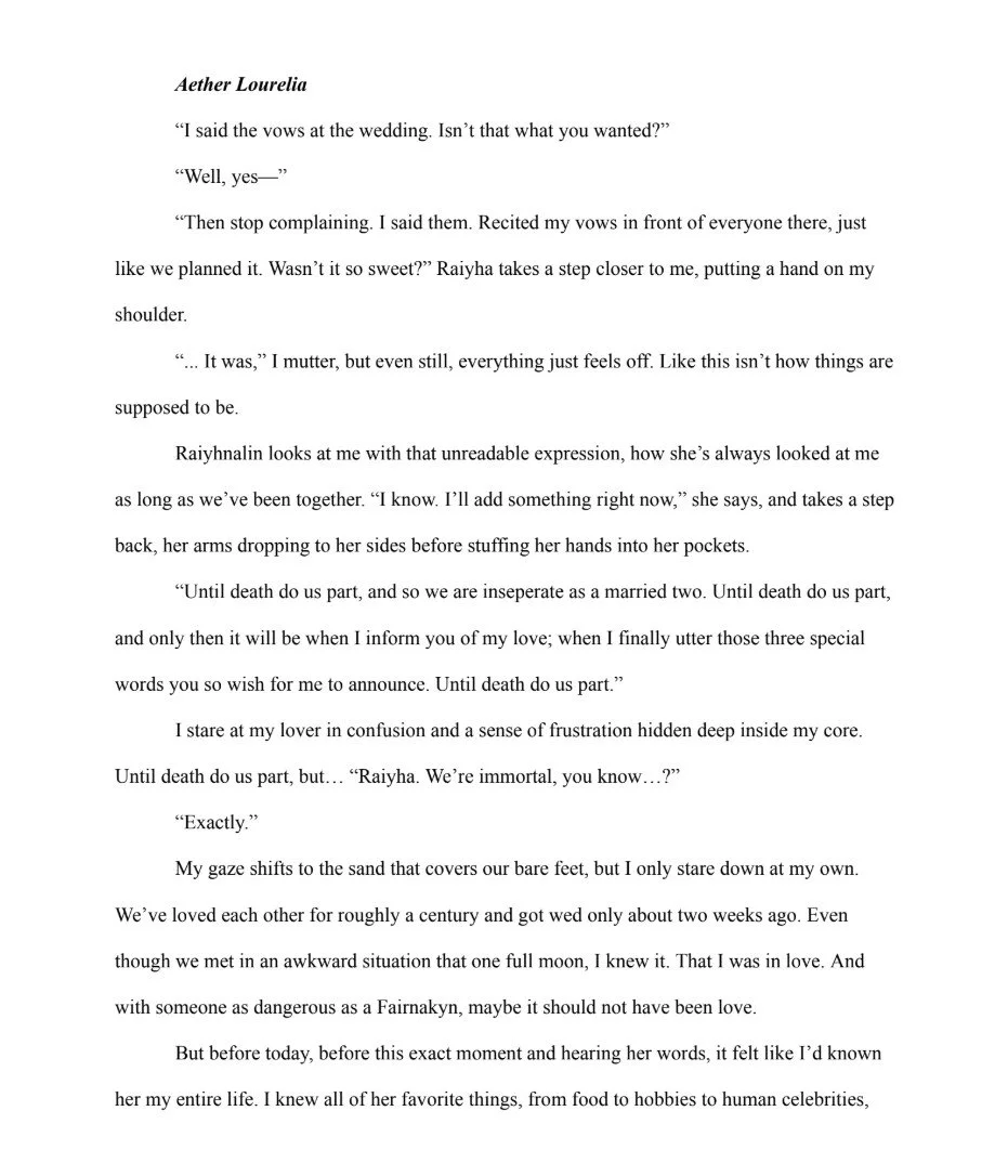 This is a sapphic/LGBTQ+ horror, romance, and fantasy story. This bit I am sharing with you all is just an excerpt from the end of the story, since a lot of people seemed to like it. The whole story is unfinished as of right now, so I hope to complete it by 2026, but the first thing I wrote out for it was the ending, and I am working on building up to it.