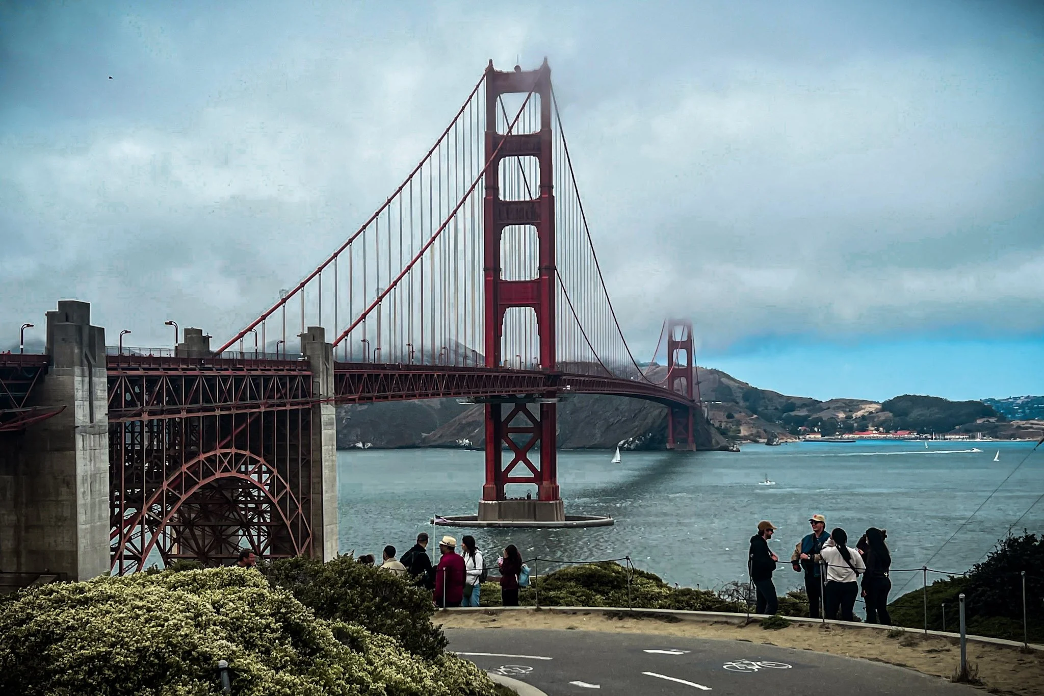 This picture shows a really big red bridge stretching over some water with a bunch of people standing around looking impressed. The top of the bridge is kinda hiding in some clouds, which makes it look mysterious or maybe just foggy. There are boats and little white sails on the water, like they’re having a chill day. The people in front look like they’re about to take a hundred selfies. The plants are doing their best to look important in the foreground.
