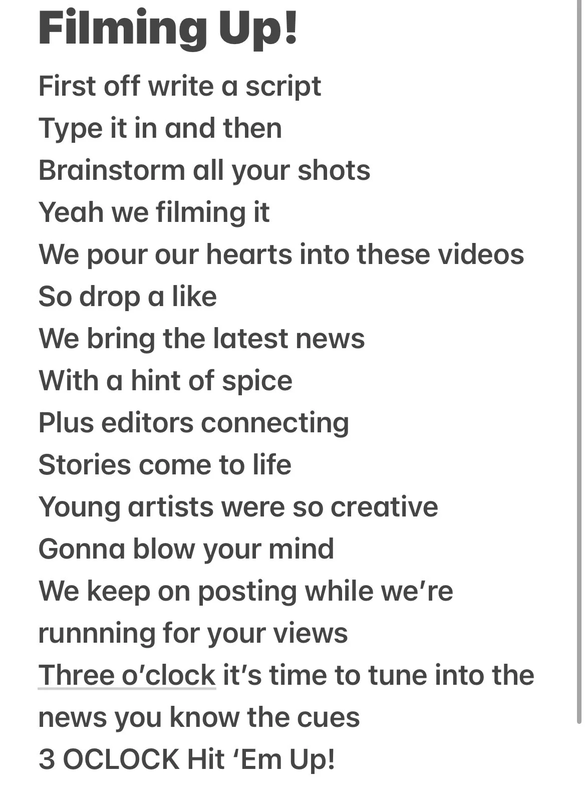 Hello, I’m Noelle Correa and I made this song for a club I’m in called 3 O'clock News. We make news videos that we watch during our assemblies every week covering hot topics and important updates which is why the lyrics are taking about filmmaking. I used the instrumental from Tupac Shakur’s, “Hit ‘Em Up”, and followed the original flow as well. I wrote the lyrics myself and carefully made sure to acknowledge the work that all of my fellow club members and I put into our bi-weekly videos. With this track I am finally putting myself out there and taking a chance because every artist needs to start somewhere and this track is sort of what I would like to consider my “start”! I hope you can bop your head to this track, thank you!