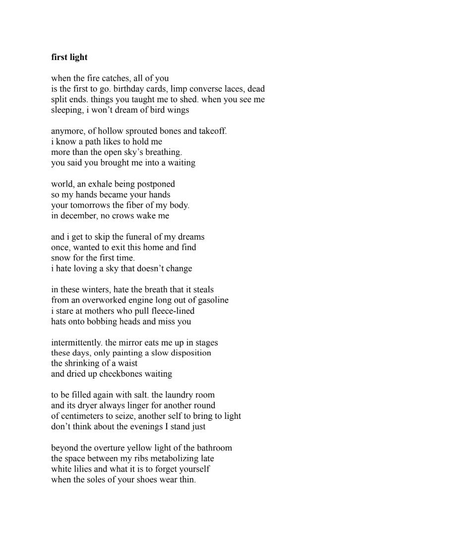 "first light" is a poem where I didn't set out with a specific theme or topic in mind, but kind of let it reveal itself as I was writing line by line. Even still, I think there is an interesting sense of ambiguity that allows each reader to interpret what the poem is about for themselves. To me, it's mostly centered around this idea of growing up and leaving home and my mom behind. As for the writing process, I really tried to pay attention to the allocation of breath and the spacing of words in this poem. I played around a lot with the commas and the line breaks, and trying to vary how long every sentence was before a period.