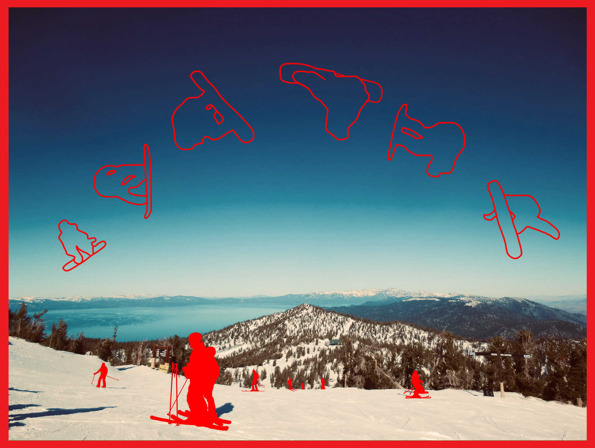 This piece features red silhouettes of skiers and snowboarders, accompanied by a silhouette of a snowboarder flipping through the air. I have always loved the thrill of snow sports, and I made this piece to capture the moment of flying through the air, over a beautiful landscape view. I took this photo while I was out snowboarding, but I felt the image was too still to truly represent what it's like to snowboard. I wanted to capture the feeling of speed and exhilaration, so later I added the digital art. The red abstracted outlines emphasise motion and energy, which contrast with the calm landscape. This piece also reflects the harmony between the rider and the environment, showing how snowboarding deepens my connection to nature and makes me appreciate the landscape in a more immersive, physical way.