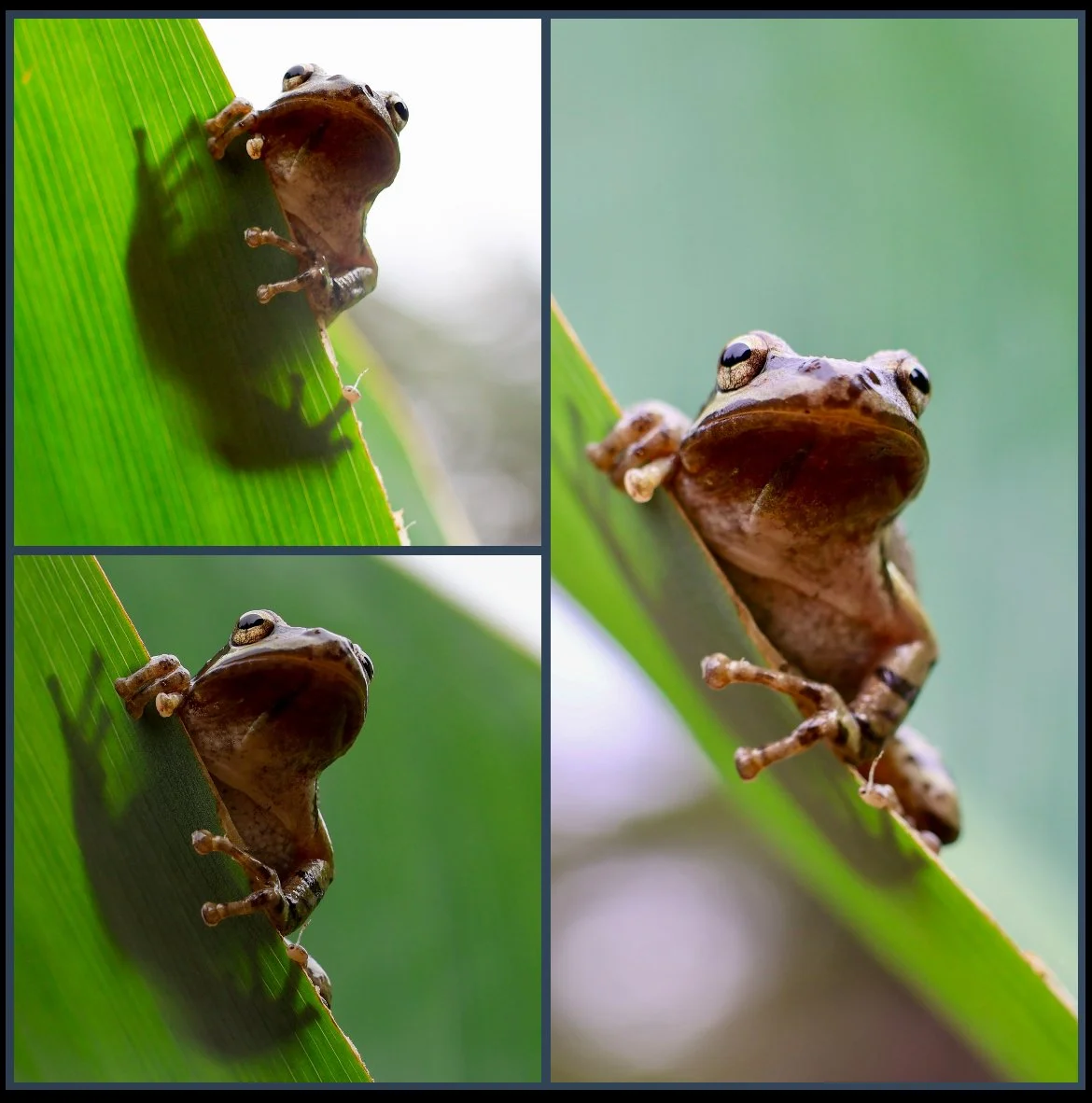 I try to photograph the usually overlooked creatures in nature. This photograph was taken in my garden after a rain. It took many attempts and edits to get the photos I have. I had to be very patient with the frogs because they would hop away and I would have to find them again.